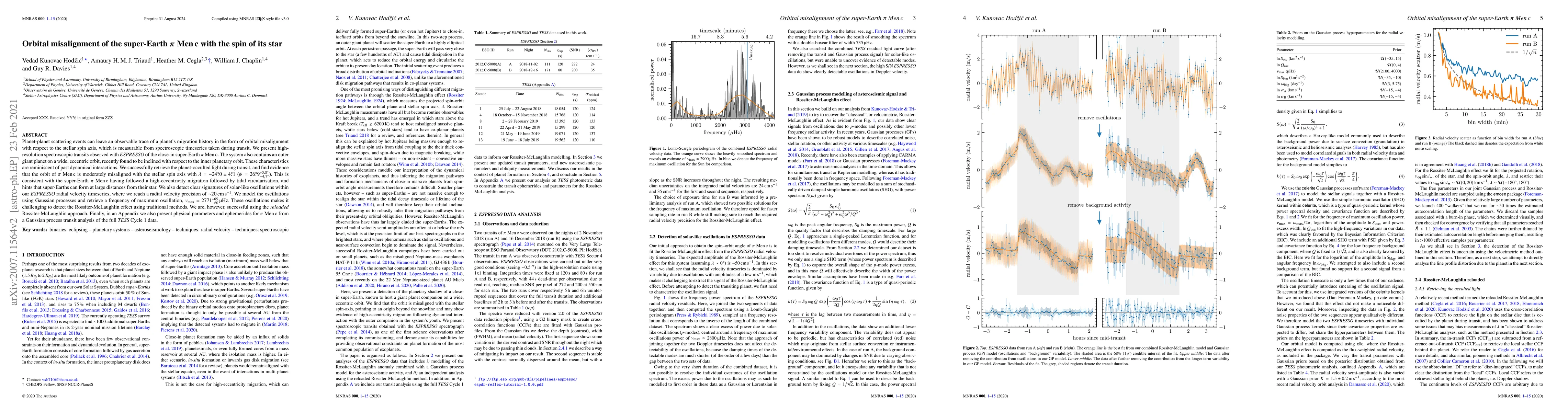 This paper reports high-resolution spectroscopic observations of the super-Earth $\pi$ Men c, revealing a moderate orbital misalignment with its star's spin axis, indicative of a high-eccentricity migration history. The study also detects solar-like oscillations and successfully applies a reloaded Rossiter-McLaughlin approach to confirm the misalignment.