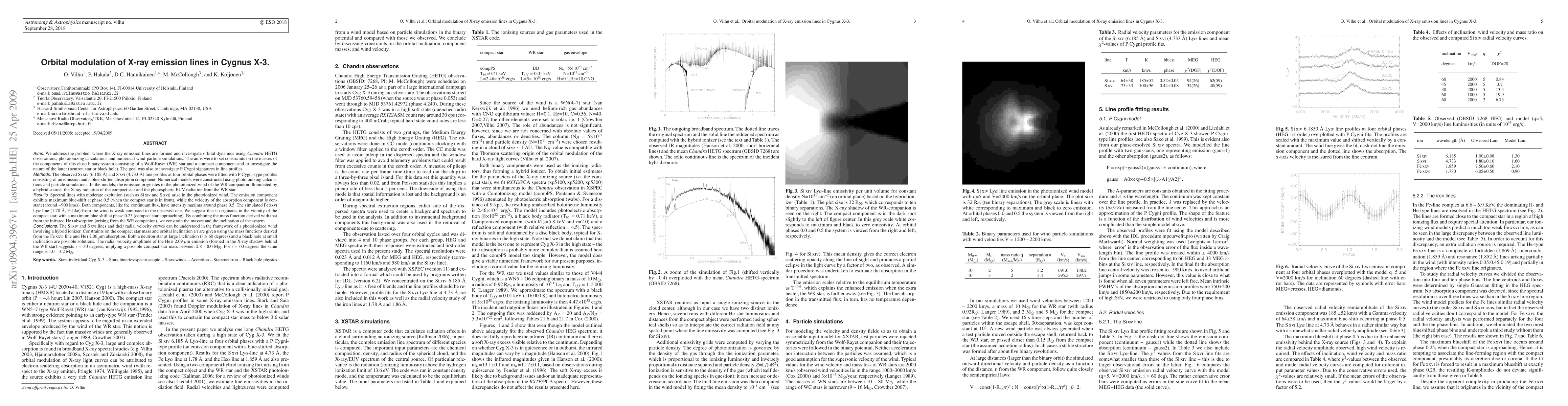 We address the problem where the X-ray emission lines are formed and investigate orbital dynamics using Chandra HETG observations, photoionizing calculations and numerical wind-particle simulations.The observed Si XIV (6.185 A) and S XVI (4.733 A) line profiles at four orbital phases were fitted with P Cygni-type profiles consisting of an emission and a blue-shifted absorption component. In the models, the emission originates in the photoionized wind of the WR companion illuminated by a hybrid source: the X-ray radiation of the compact star and the photospheric EUV-radiation from the WR star. The emission component exhibits maximum blue-shift at phase 0.5 (when the compact star is in front), while the velocity of the absorption component is constant (around -900 km/s). The simulated FeXXVI Ly alpha line (1.78 A) from the wind is weak compared to the observed one. We suggest that it originates in the vicinity of the compact star, with a maximum blue shift at phase 0.25 (compact star approaching). By combining the mass function derived with that from the infrared HeI absorption (arising from the WR companion), we constrain the masses and inclination of the system. Both a neutron star at large inclination (over 60 degrees) and a black hole at small inclination are possible solutions.
