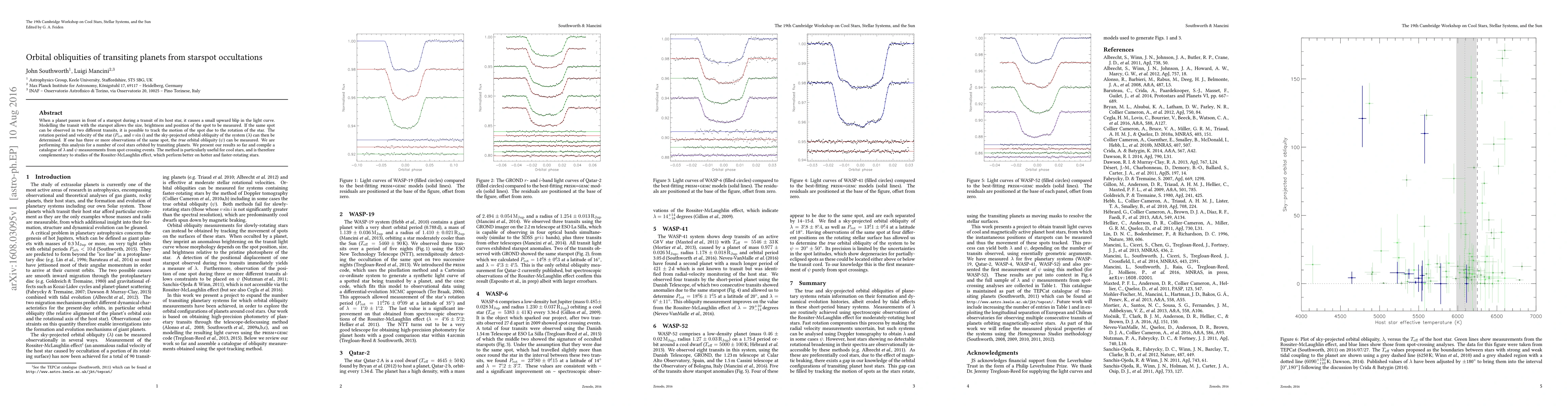 This paper investigates the orbital obliquities of transiting planets by analyzing starspot occultations, determining the sky-projected and true obliquities through multiple transit observations. The method is particularly effective for cool stars, offering a complementary approach to the Rossiter-McLaughlin effect used for hotter stars.