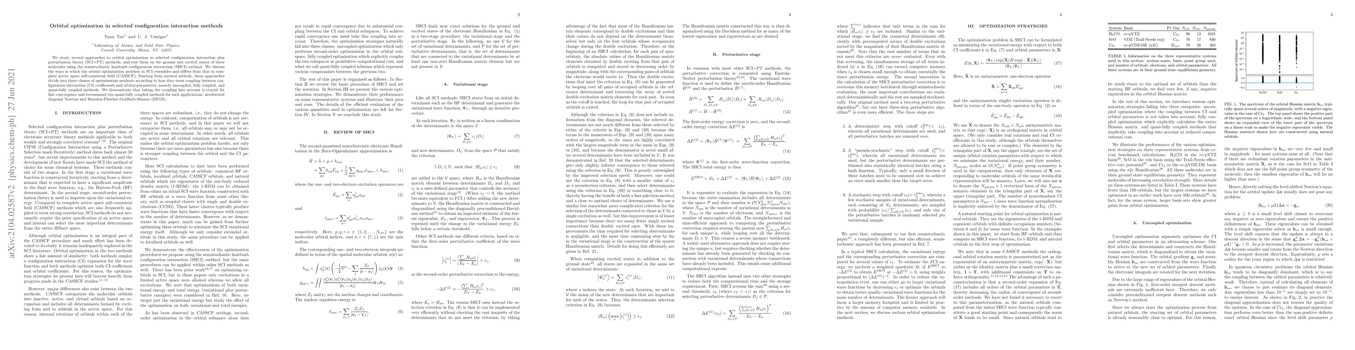 This paper investigates various orbital optimization techniques in selected configuration interaction methods, particularly focusing on SCI+PT. It finds that quasi-fully coupled methods, such as accelerated diagonal Newton and BFGS, provide the best convergence for ground and excited states, highlighting the importance of coupling between CI coefficients and orbital parameters.