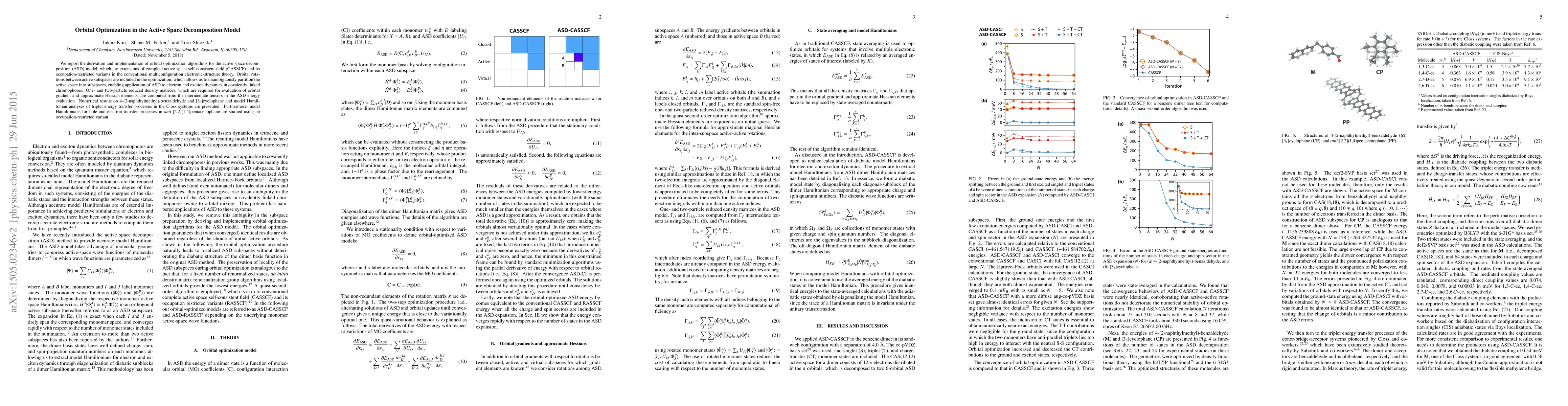This paper introduces orbital optimization algorithms for the Active Space Decomposition (ASD) model, extending CASSCF and its variants. These algorithms enable unambiguous partitioning of the active space, applicable to electron and exciton dynamics in linked chromophores. Numerical results on specific molecules and model Hamiltonians for hole and electron transfer processes are provided, demonstrating the method's utility in studying complex molecular systems.