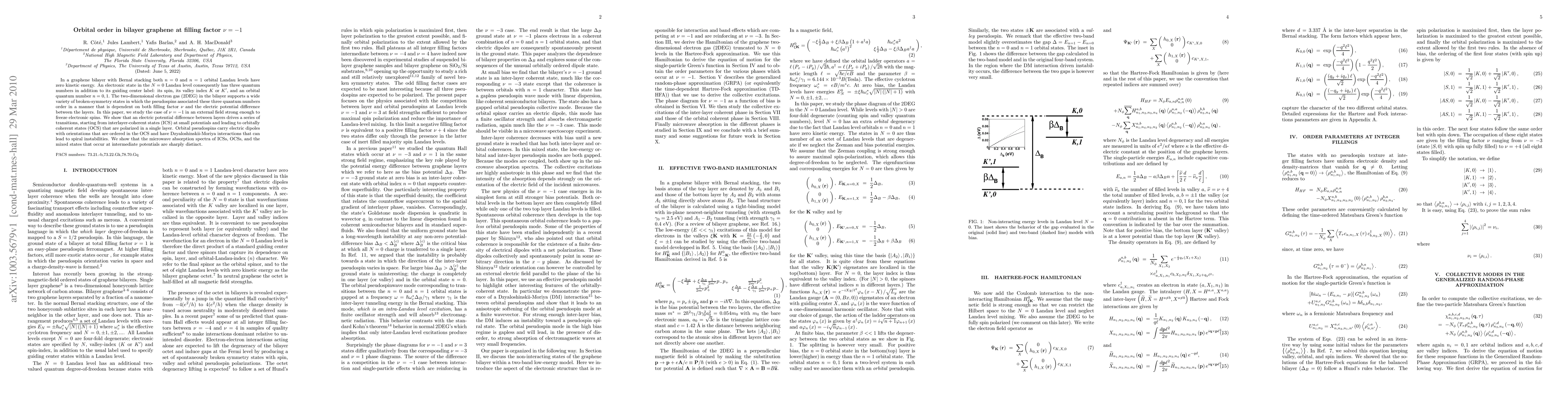This paper investigates orbital order in bilayer graphene at filling factor ν = -1, demonstrating that varying electric potential differences between layers induces transitions from interlayer-coherent states to orbitally coherent states. These states exhibit distinct microwave absorption spectra and spiral instabilities due to ordered dipoles.