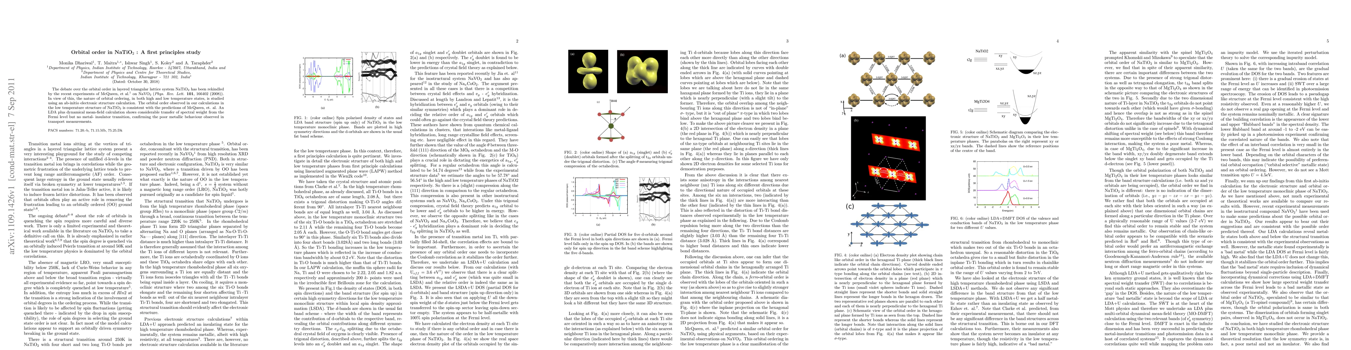 The debate over the orbital order in layered triangular lattice system NaTiO$_2$ has been rekindled by the recent experiments of McQueen, et al. \cite{cava} on NaVO$_2$ ({\em Phys. Rev. Lett.} {\bf 101}, 166402 (2008)). In view of this, the nature of orbital ordering, in both high and low temperature states, is studied using an ab-initio electronic structure calculation. The orbital order observed in our calculations in the low temperature structure of NaTiO$_2$ is consistent with the predictions of McQueen, et. al. An LDA plus dynamical mean-field calculation shows considerable transfer of spectral weight from the Fermi level but no metal- insulator transition, confirming the poor metallic behaviour observed in transport measurements.