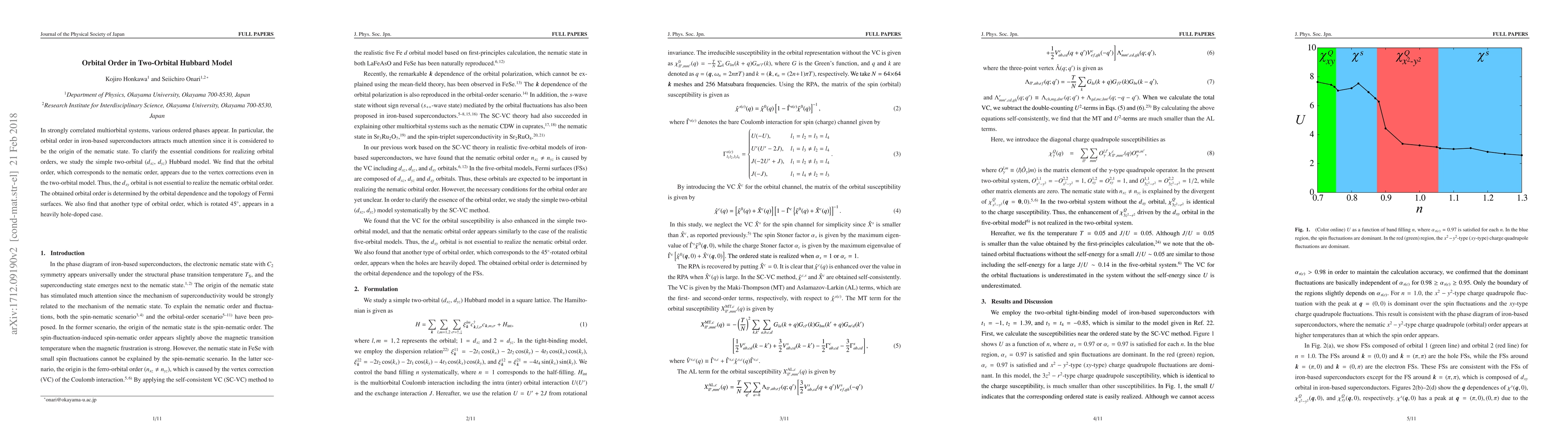 This paper investigates the orbital order in a two-orbital Hubbard model, revealing that nematic order can emerge due to vertex corrections, independent of the $d_{xy}$ orbital. The study finds that the orbital order depends on the orbital dependence and the topology of the Fermi surfaces, with a rotated $45^\circ$ orbital order appearing in heavily hole-doped conditions.