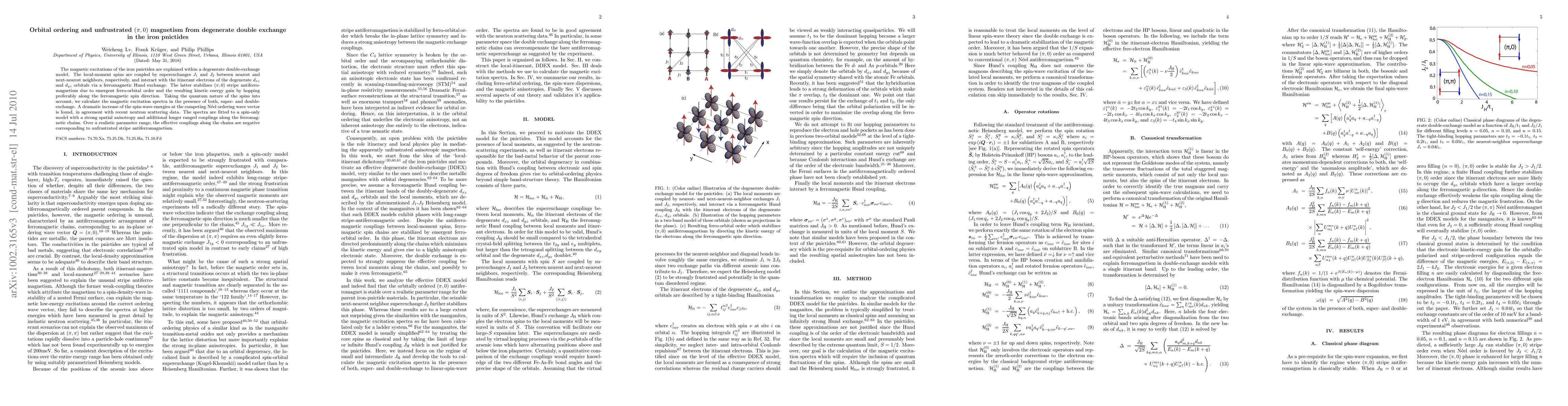 This paper explains the magnetic excitations in iron pnictides using a degenerate double-exchange model, showing how ferro-orbital order stabilizes $(\pi,0)$ stripe antiferromagnetism, and fits calculated magnetic spectra to observed neutron scattering data, revealing unfrustrated magnetism.