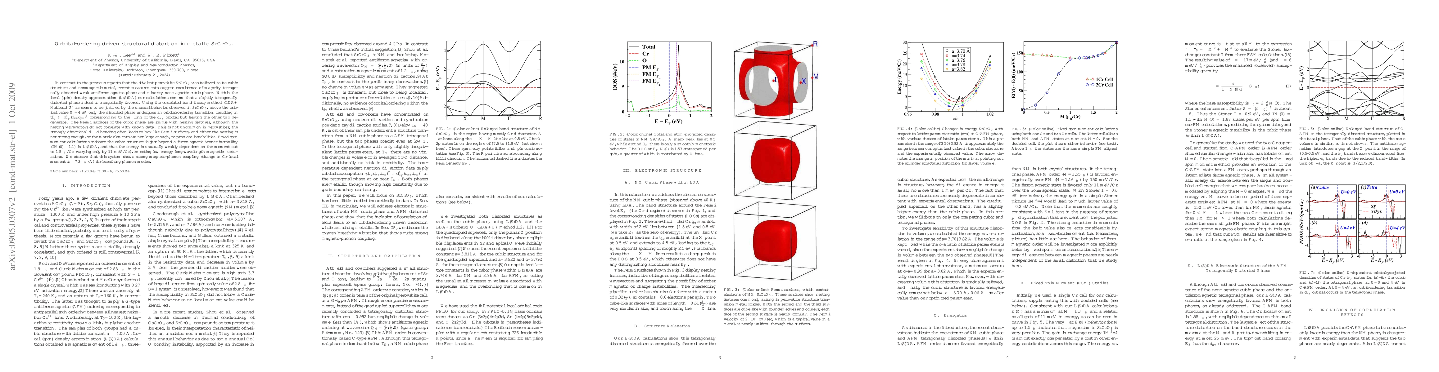 In contrast to the previous reports that the divalent perovskite SrCrO$_3$ was believed to be cubic structure and nonmagnetic metal, recent measurements suggest coexistence of majority tetragonally distorted weak antiferromagnetic phase and minority nonmagnetic cubic phase. Within the local (spin) density approximation (L(S)DA) our calculations confirm that a slightly tetragonally distorted phase indeed is energetically favored. Using the correlated band theory method (LDA+ Hubbard U) as seems to be justified by the unusual behavior observed in SrCrO$_3$, above the critical value $U_c$=4 eV only the distorted phase undergoes an orbital-ordering transition, resulting in $t_{2g}^2 --> d_{xy}^1$($d_{xz}d_{yz}$)$^1$ corresponding to the filling of the $d_{xy}$ orbital but leaving the other two degenerate. The Fermi surfaces of the cubic phase are simple with nesting features, although the nesting wavevectors do not correlate with known data. This is not uncommon in perovskites; the strongly directional d-d bonding often leads to boxlike Fermi surfaces, and either the nesting is not strong enough, or the matrix elements are not large enough, to promote instabilities. Fixed spin moment calculations indicate the cubic structure is just beyond a ferromagnetic Stoner instability (IN(0)~1.1) in L(S)DA, and that the energy is unusually weakly dependent on the moment out to 1.5$\mu_B$/Cr (varying only by 11 meV/Cr), reflecting low energy long-wavelength magnetic fluctuations. We observe that this system shows strong magneto-phonon coupling (change in Cr local moment is ~7.3 $\mu_B$/\AA) for breathing phonon modes.