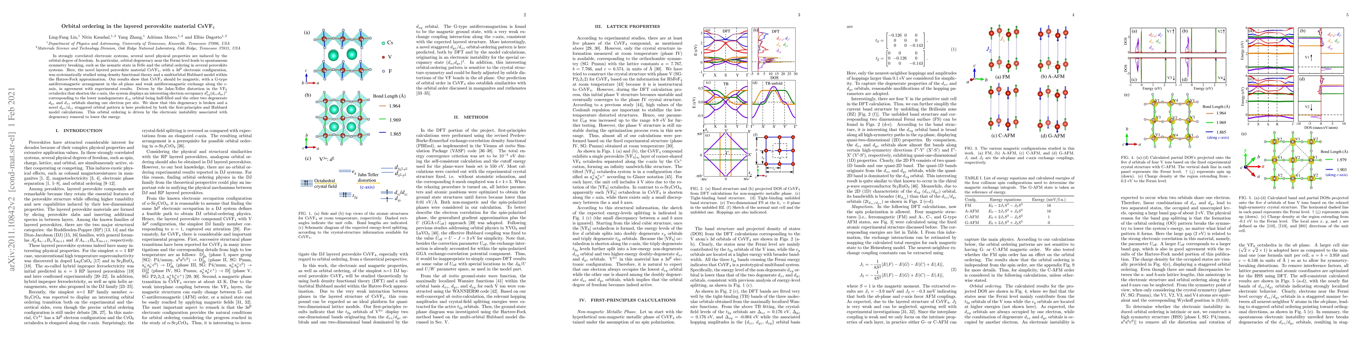 In strongly correlated electronic systems, several novel physical properties are induced by the orbital degree of freedom. In particular, orbital degeneracy near the Fermi level leads to spontaneous symmetry breaking, such as the nematic state in FeSe and the orbital ordering in several perovskite systems. Here, the novel layered perovskite material CsVF$_4$, with a $3d^2$ electronic configuration, was systematically studied using density functional theory and a multiorbital Hubbard model within the Hatree-Fock approximation. Our results show that CsVF$_4$ should be magnetic, with a G-type antiferromagnetic arrangement in the $ab$ plane and weak antiferromagnetic exchange along the $c$-axis, in agreement with experimental results. Driven by the Jahn-Teller distortion in the VF$_6$ octahedra that shorten the $c$-axis, the system displays an interesting electron occupancy $d_{xy}^1(d_{xz}d_{yz})^1$ corresponding to the lower nondegenerate $d_{xy}$ orbital being half-filled and the other two degenerate $d_{yz}$ and $d_{xz}$ orbitals sharing one electron per site. We show that this degeneracy is broken and a novel $d_{yz}$/$d_{xz}$ staggered orbital pattern is here predicted by both the first-principles and Hubbard model calculations. This orbital ordering is driven by the electronic instability associated with degeneracy removal to lower the energy.