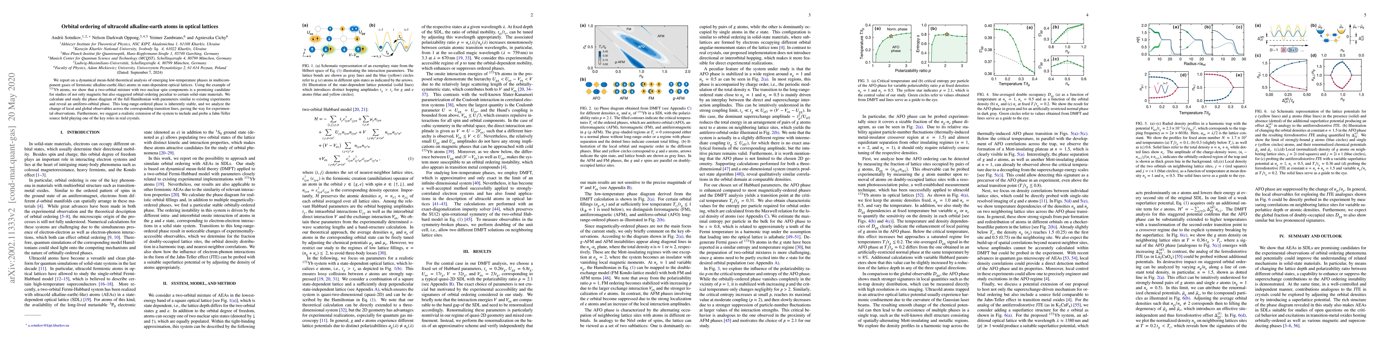 We report on a dynamical mean-field theoretical analysis of emerging low-temperature phases in multicomponent gases of fermionic alkaline-earth(-like) atoms in state-dependent optical lattices. Using the example of $^{173}$Yb atoms, we show that a two-orbital mixture with two nuclear spin components is a promising candidate for studies of not only magnetic but also staggered orbital ordering peculiar to certain solid-state materials. We calculate and study the phase diagram of the full Hamiltonian with parameters similar to existing experiments and reveal an antiferroorbital phase. This long-range-ordered phase is inherently stable, and we analyze the change of local and global observables across the corresponding transition lines, paving the way for experimental observations. Furthermore, we suggest a realistic extension of the system to include and probe a Jahn-Teller source field playing one of the key roles in real crystals.