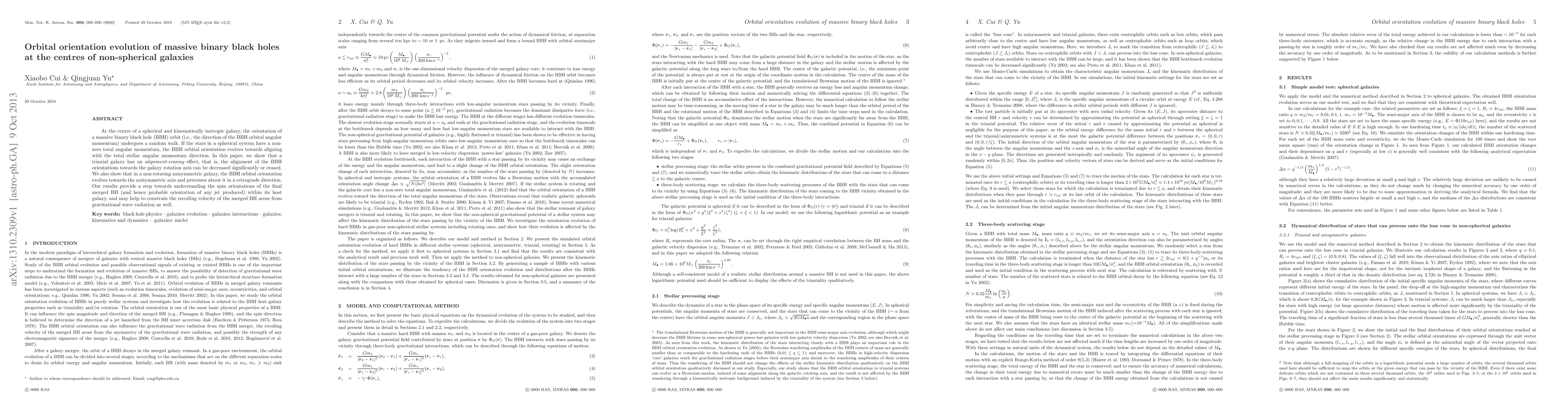 This paper investigates the evolution of massive binary black hole (BBH) orbital orientations in non-spherical galaxies, showing that triaxial galaxies can erase alignment towards the galaxy rotation axis, while non-rotating axisymmetric galaxies cause BBH to align with the axisymmetric axis. The findings contribute to understanding the final merged black hole's spin orientation and its gravitational wave recoil velocity.
