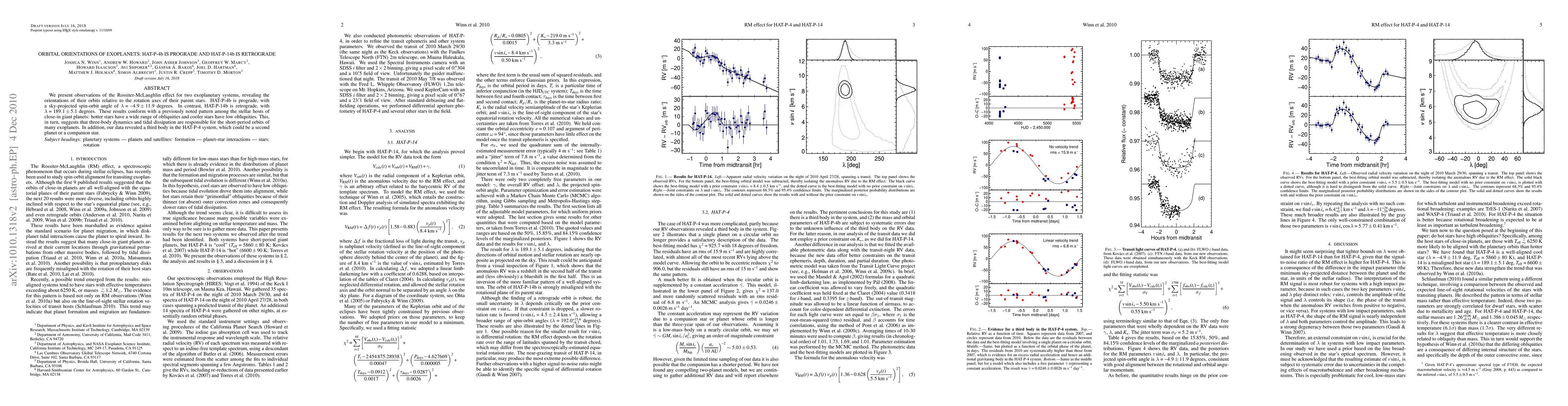 We present observations of the Rossiter-McLaughlin effect for two exoplanetary systems, revealing the orientations of their orbits relative to the rotation axes of their parent stars. HAT-P-4b is prograde, with a sky-projected spin-orbit angle of lambda = -4.9 +/- 11.9 degrees. In contrast, HAT-P-14b is retrograde, with lambda = 189.1 +/- 5.1 degrees. These results conform with a previously noted pattern among the stellar hosts of close-in giant planets: hotter stars have a wide range of obliquities and cooler stars have low obliquities. This, in turn, suggests that three-body dynamics and tidal dissipation are responsible for the short-period orbits of many exoplanets. In addition, our data revealed a third body in the HAT-P-4 system, which could be a second planet or a companion star.