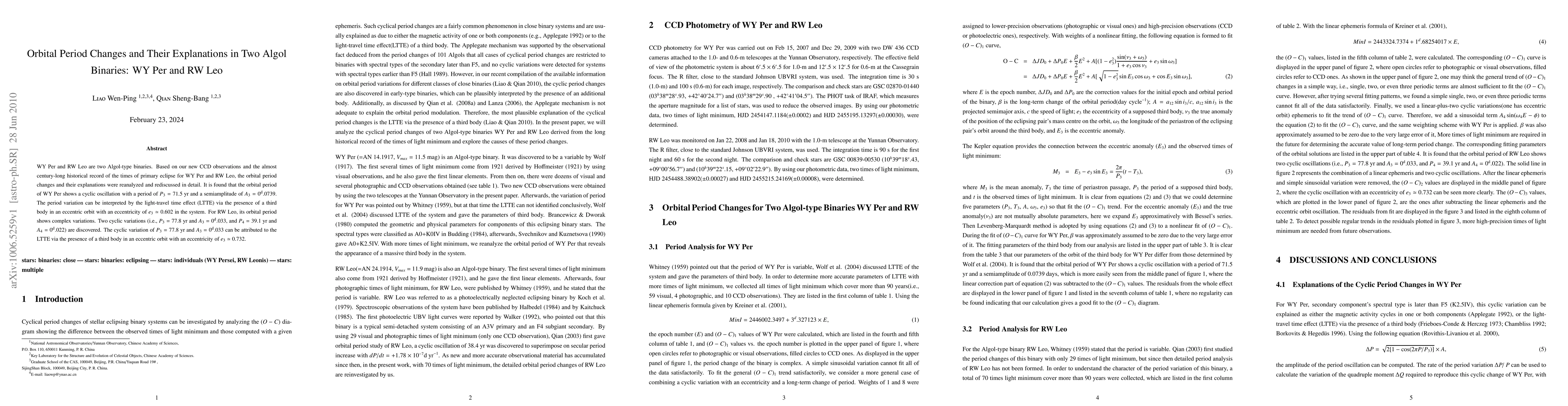 The research reanalyzed orbital period changes in Algol binaries WY Per and RW Leo, finding cyclic oscillations due to light-travel time effect. WY Per's oscillation has a period of 71.5 years and an eccentric third body, while RW Leo shows two cyclic variations, one of 77.8 years linked to an eccentric third body with e~0.732.