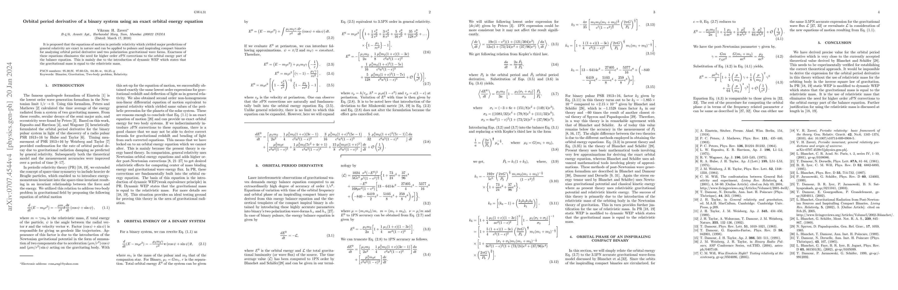 Summary: This paper proposes that the exact equations of motion in periodic relativity can be used to analyze the orbital period derivative and gravitational wave forms in pulsars and inspiraling compact binaries without needing higher order corrections, thanks to the dynamic Weak Equivalence Principle equating gravitational and relativistic mass.
