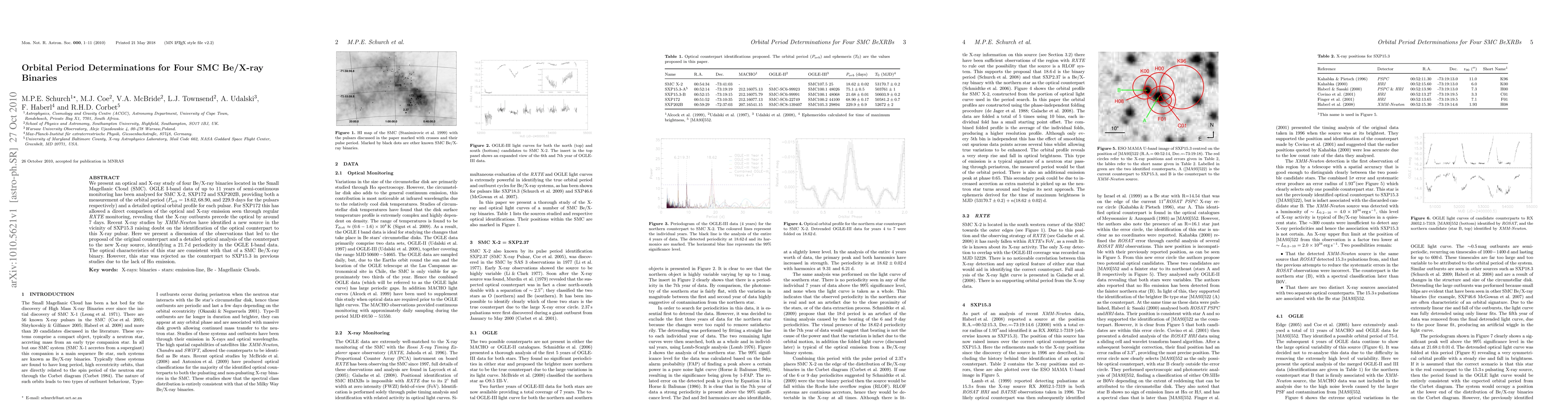 This study analyzes optical and X-ray data for four Be/X-ray binaries in the Small Magellanic Cloud, determining orbital periods and comparing optical and X-ray emissions. A new optical counterpart for an X-ray source, SXP15.3, is identified with a 21.7-day periodicity, though previous studies had rejected it due to lack of H{\alpha} emission.