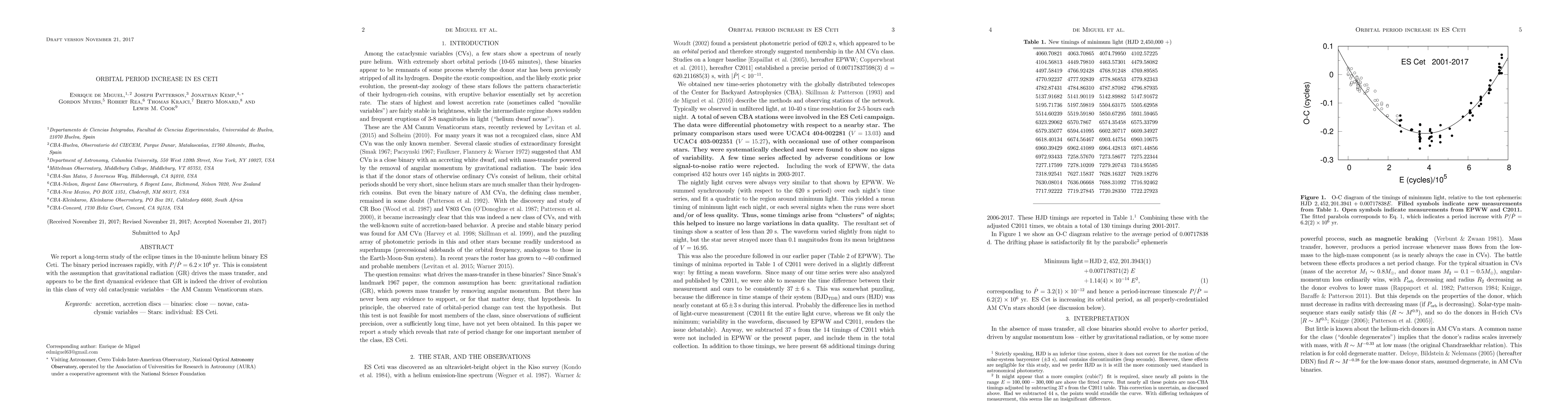 We report a long-term study of the eclipse times in the 10-minute helium binary ES Ceti. The binary period increases rapidly, with P/P-dot = 6.2x10^6 yr. This is consistent with the assumption that gravitational radiation (GR) drives the mass transfer, and appears to be the first dynamical evidence that GR is indeed the driver of evolution in this class of very old cataclysmic variables -- the AM Canum Venaticorum stars.
