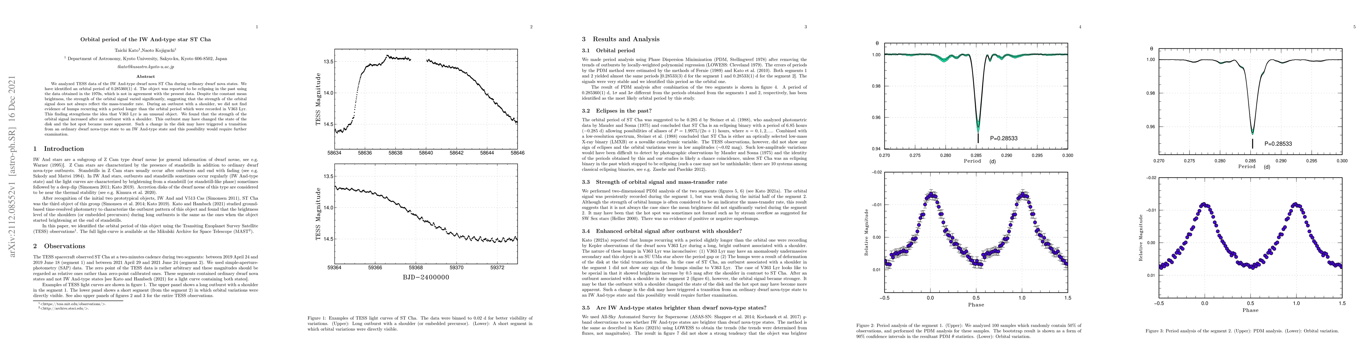The research identifies ST Cha, an IW And-type dwarf nova, with an orbital period of 0.285360(1) d using TESS data. It reveals that the object's constant mean brightness with varying orbital signal strength suggests the signal doesn't always correlate with mass-transfer rate. The study also observes no long-period humps during outbursts, unlike V363 Lyr, and proposes that an outburst with a shoulder might transition ST Cha from a dwarf nova to an IW And-type state, requiring further investigation.