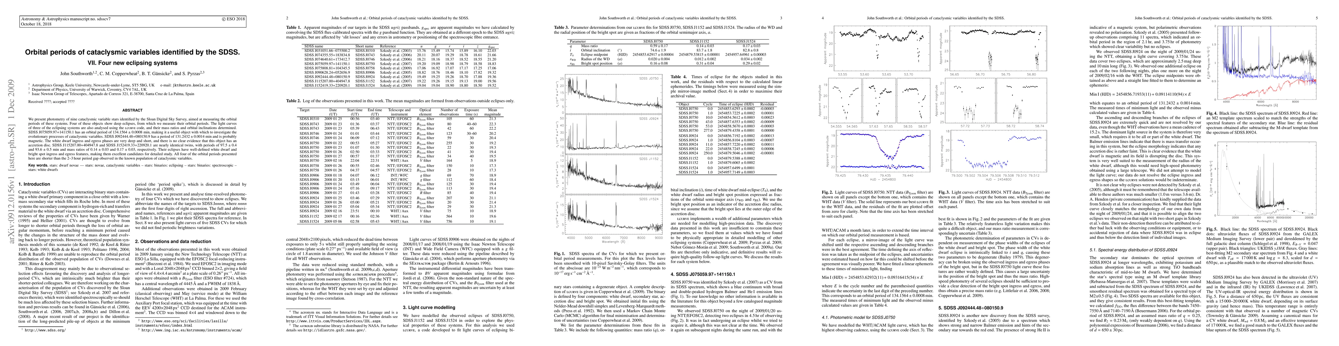 We present photometry of nine cataclysmic variable stars identified by the Sloan Digital Sky Survey, aimed at measuring the orbital periods of these systems. Four of these objects show deep eclipses, from which we measure their orbital periods. The light curves of three of the eclipsing systems are also analysed using the LCURVE code, and their mass ratios and orbital inclinations determined. SDSS J075059.97+141150.1 has an orbital period of 134.1564 +/- 0.0008 min, making it a useful object with which to investigate the evolutionary processes of cataclysmic variables. SDSS J092444.48+080150.9 has a period of 131.2432 +/- 0.0014 min and is probably magnetic. The white dwarf ingress and egress phases are very deep and short, and there is no clear evidence that this object has an accretion disc. SDSS J115207.00+404947.8 and SDSS J152419.33+220920.1 are nearly identical twins, with periods of 97.5 +/- 0.4 and 93.6 +/- 0.5 min and mass ratios of 0.14 +/- 0.03 and 0.17 +/- 0.03, respectively. Their eclipses have well-defined white dwarf and bright spot ingress and egress features, making them excellent candidates for detailed study. All four of the orbital periods presented here are shorter than the 2-3 hour period gap observed in the known population of cataclysmic variables.