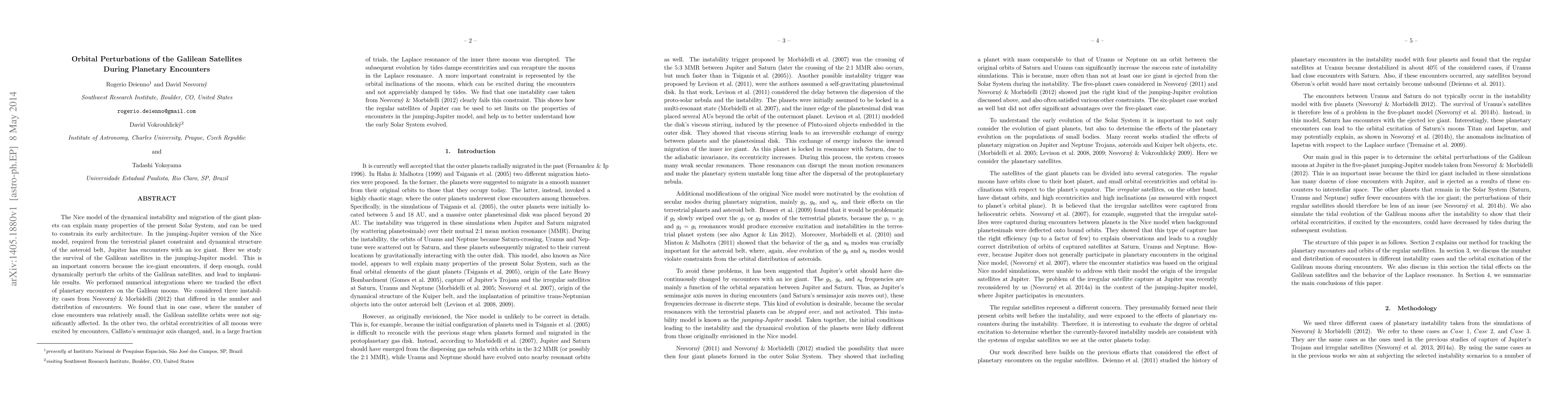 The Nice model of the dynamical instability and migration of the giant planets can explain many properties of the present Solar System, and can be used to constrain its early architecture. In the jumping-Jupiter version of the Nice model, required from the terrestrial planet constraint and dynamical structure of the asteroid belt, Jupiter has encounters with an ice giant. Here we study the survival of the Galilean satellites in the jumping-Jupiter model. This is an important concern because the ice-giant encounters, if deep enough, could dynamically perturb the orbits of the Galilean satellites, and lead to implausible results. We performed numerical integrations where we tracked the effect of planetary encounters on the Galilean moons. We considered three instability cases from Nesvorny & Morbidelli (2012) that differed in the number and distribution of encounters. We found that in one case, where the number of close encounters was relatively small, the Galilean satellite orbits were not significantly affected. In the other two, the orbital eccentricities of all moons were excited by encounters, Callisto's semimajor axis changed, and, in a large fraction of trials, the Laplace resonance of the inner three moons was disrupted. The subsequent evolution by tides damps eccentricities and can recapture the moons in the Laplace resonance. A more important constraint is represented by the orbital inclinations of the moons, which can be excited during the encounters and not appreciably damped by tides. We find that one instability case taken from Nesvorny & Morbidelli (2012) clearly fails this constraint. This shows how the regular satellites of Jupiter can be used to set limits on the properties of encounters in the jumping-Jupiter model, and help us to better understand how the early Solar System evolved.