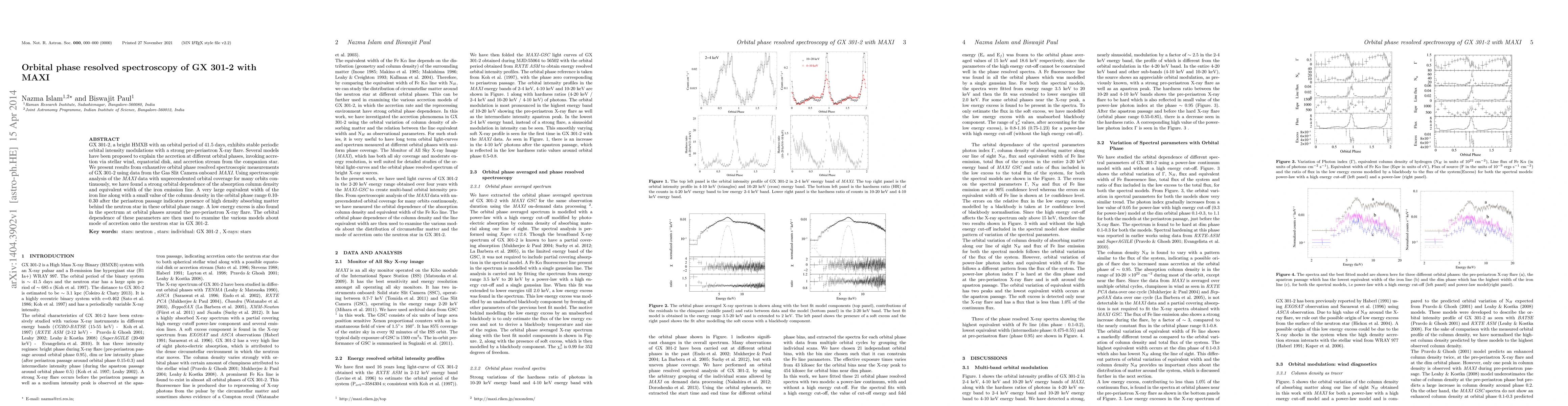 GX 301-2, a bright HMXB with an orbital period of 41.5 days, exhibits stable periodic orbital intensity modulations with a strong pre-periastron X-ray flare. Several models have been proposed to explain the accretion at different orbital phases, invoking accretion via stellar wind, equatorial disk, and accretion stream from the companion star. We present results from exhaustive orbital phase resolved spectroscopic measurements of GX 301-2 using data from the Gas Slit Camera onboard MAXI. Using spectroscopic analysis of the MAXI data with unprecendented orbital coverage for many orbits continuously, we have found a strong orbital dependence of the absorption column density and equivalent width of the iron emission line. A very large equivalent width of the iron line along with a small value of the column density in the orbital phase range 0.10-0.30 after the periastron passage indicates presence of high density absorbing matter behind the neutron star in these orbital phase range. A low energy excess is also found in the spectrum at orbital phases around the pre-periastron X-ray flare. The orbital dependence of these parameters are then used to examine the various models about mode of accretion onto the neutron star in GX 301-2.