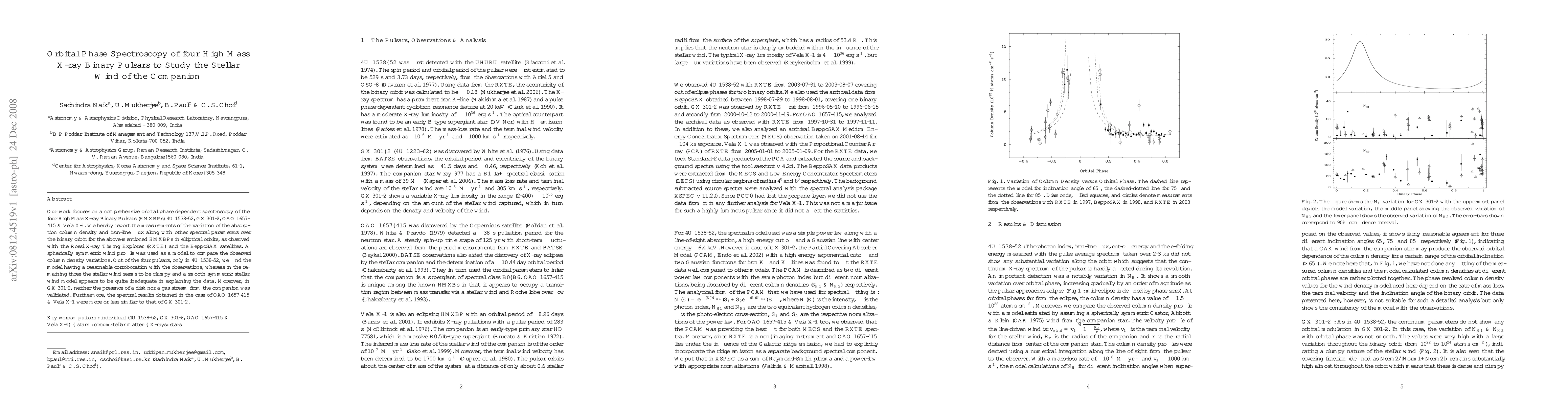Our work focuses on a comprehensive orbital phase dependent spectroscopy of the four High Mass X-ray Binary Pulsars (HMXBPs) 4U 1538-52, GX 301-2, OAO 1657-415 & Vela X-1. We hereby report the measurements of the variation of the absorption column density and iron-line flux along with other spectral parameters over the binary orbit for the above-mentioned HMXBPs in elliptical orbits, as observed with the Rossi X-ray Timing Explorer (RXTE) and the BeppoSAX satellites. A spherically symmetric wind profile was used as a model to compare the observed column density variations. Out of the four pulsars, only in 4U 1538-52, we find the model having a reasonable corroboration with the observations, whereas in the remaining three the stellar wind seems to be clumpy and a smooth symmetric stellar wind model appears to be quite inadequate in explaining the data. Moreover, in GX 301-2, neither the presence of a disk nor a gas stream from the companion was validated. Furthermore, the spectral results obtained in the case of OAO 1657-415 & Vela X-1 were more or less similar to that of GX 301-2.