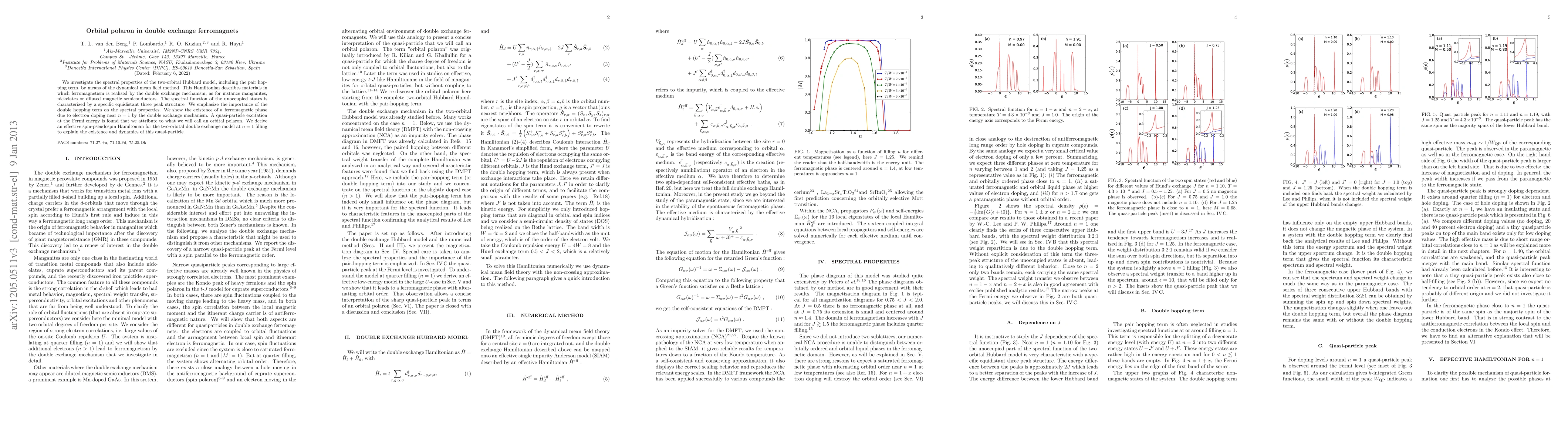 We investigate the spectral properties of the two-orbital Hubbard model, including the double hopping term, by means of the dynamical mean field method. This Hamiltonian describes materials in which ferromagnetism is realized by the double exchange mechanism, like for instance manganites, nickelates or diluted magnetic semiconductors. The spectral function of the unoccupied states is characterized by a specific equidistant three peak structure. We emphasize the importance of the double hopping term on the spectral properties. We show the existence of a ferromagnetic phase due to electron doping near n=1 by the double exchange mechanism. A quasi-particle excitation at the Fermi energy is found that we attribute to what we will call an orbital polaron. We derive an effective spin-pseudospin Hamiltonian for the two-orbital double exchange model at n=1 filling to explain the existence and dynamics of this quasi-particle.