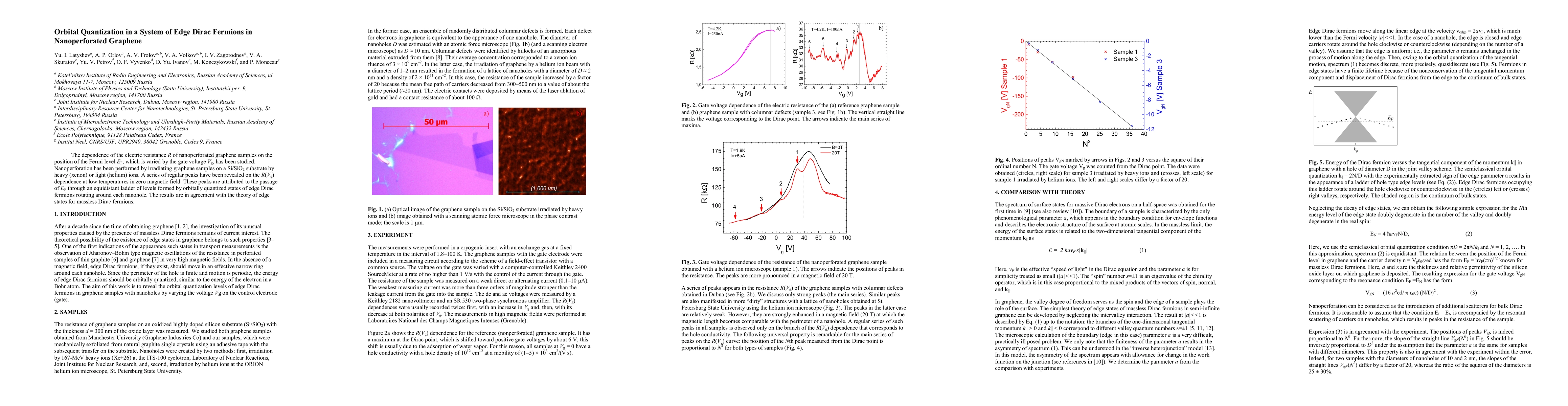 Summary: Research investigates the electric resistance of nanoperforated graphene with varying Fermi levels, revealing regular peaks due to quantized orbital states of edge Dirac fermions, confirming theoretical predictions of edge states in massless Dirac fermions.