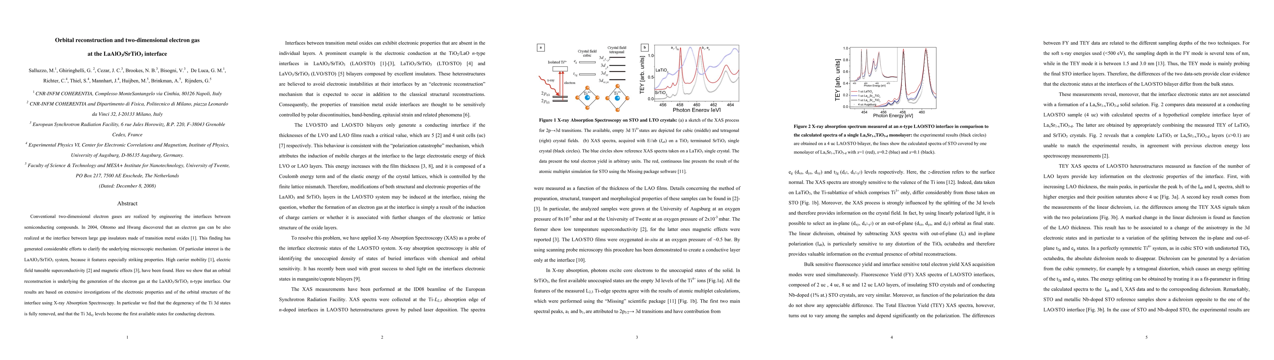 This paper demonstrates that orbital reconstruction at the LaAlO3/SrTiO3 interface leads to the generation of a two-dimensional electron gas, revealing the removal of Ti 3d states' degeneracy and the emergence of Ti 3dxy levels as the first conducting states, as confirmed through X-ray Absorption Spectroscopy.