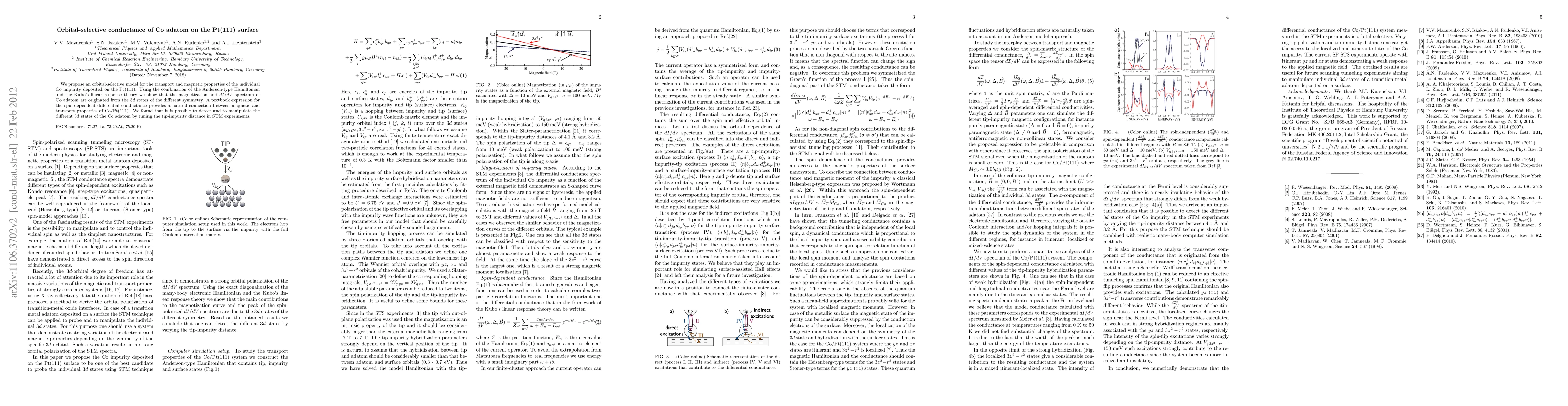 We propose an orbital-selective model for the transport and magnetic properties of the individual Co impurity deposited on the Pt(111). Using the combination of the Anderson-type Hamiltonian and the Kubo's linear response theory we show that the magnetization and dI/dV spectrum of Co adatom are originated from the 3d states of the different symmetry. A textbook expression for the spin-dependent differential conductance provides a natural connection between magnetic and transport properties of Co/Pt(111). We found that it is possible to detect and to manipulate the different 3d states of the Co adatom by tuning the spin polarization of the tip and tip-impurity distance in STM experiments.
