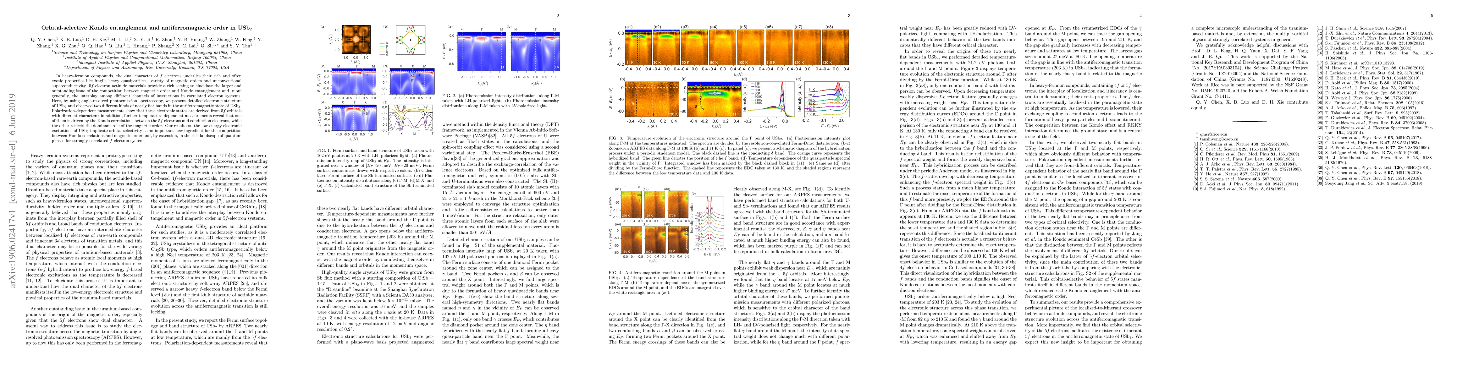 In heavy-fermion compounds, the dual character of $f$ electrons underlies their rich and often exotic properties like fragile heavy quasipartilces, variety of magnetic orders and unconventional superconductivity. 5$f$-electron actinide materials provide a rich setting to elucidate the larger and outstanding issue of the competition between magnetic order and Kondo entanglement and, more generally, the interplay among different channels of interactions in correlated electron systems. Here, by using angle-resolved photoemission spectroscopy, we present detailed electronic structure of USb$_2$ and observed two different kinds of nearly flat bands in the antiferromagnetic state of USb$_2$. Polarization-dependent measurements show that these electronic states are derived from 5$f$ orbitals with different characters; in addition, further temperature-dependent measurements reveal that one of them is driven by the Kondo correlations between the 5$f$ electrons and conduction electrons, while the other reflects the dominant role of the magnetic order. Our results on the low-energy electronic excitations of USb$_2$ implicate orbital selectivity as an important new ingredient for the competition between Kondo correlations and magnetic order and, by extension, in the rich landscape of quantum phases for strongly correlated $f$ electron systems.