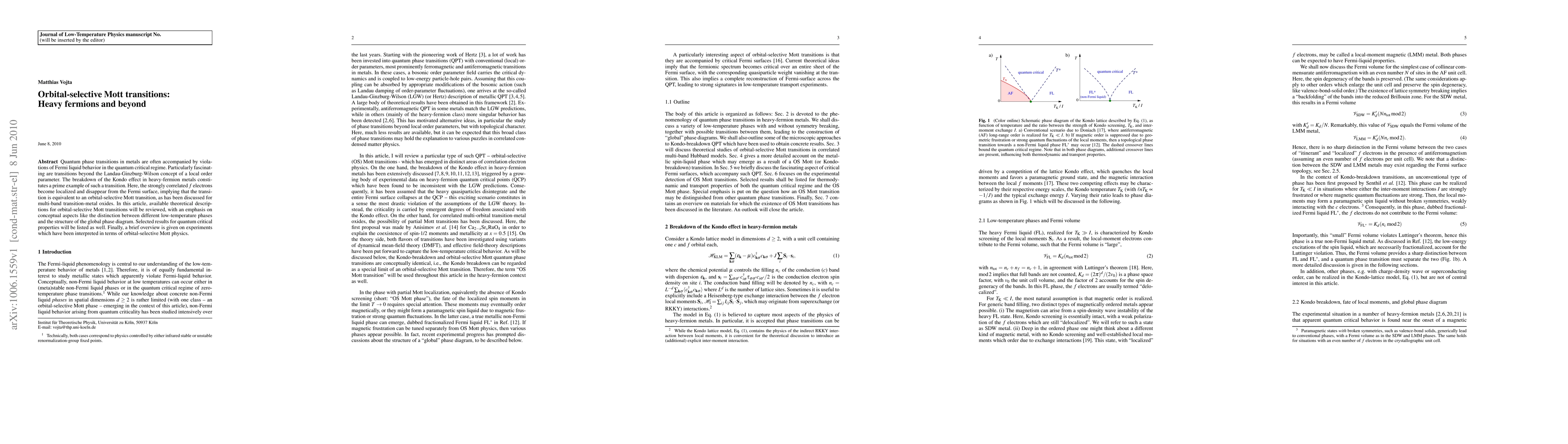 Quantum phase transitions in metals are often accompanied by violations of Fermi liquid behavior in the quantum critical regime. Particularly fascinating are transitions beyond the Landau-Ginzburg-Wilson concept of a local order parameter. The breakdown of the Kondo effect in heavy-fermion metals constitutes a prime example of such a transition. Here, the strongly correlated f electrons become localized and disappear from the Fermi surface, implying that the transition is equivalent to an orbital-selective Mott transition, as has been discussed for multi-band transition-metal oxides. In this article, available theoretical descriptions for orbital-selective Mott transitions will be reviewed, with an emphasis on conceptual aspects like the distinction between different low-temperature phases and the structure of the global phase diagram. Selected results for quantum critical properties will be listed as well. Finally, a brief overview is given on experiments which have been interpreted in terms of orbital-selective Mott physics.