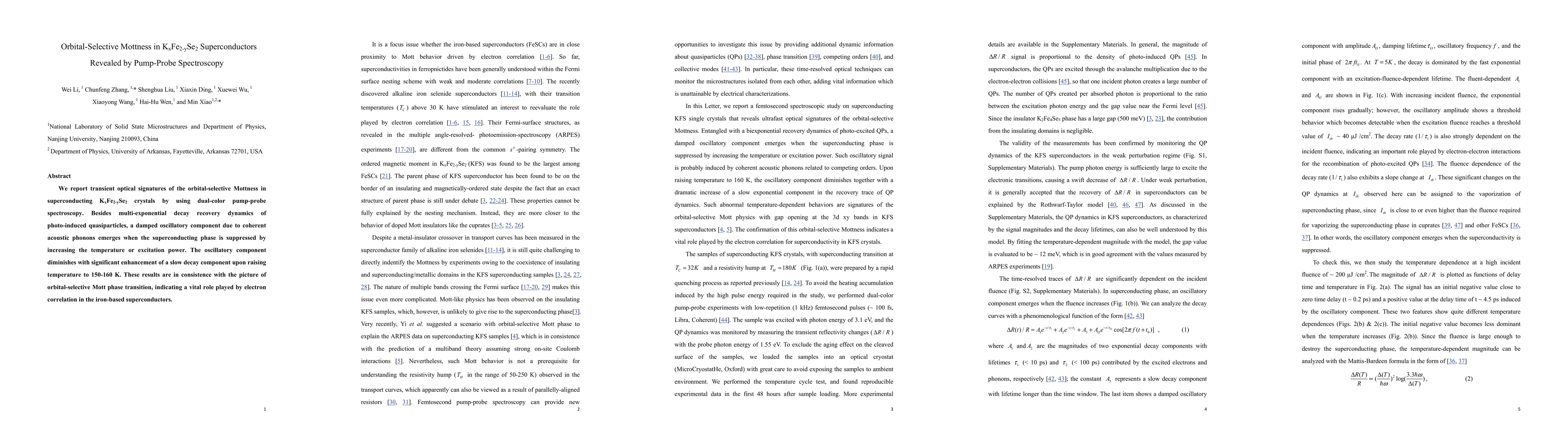 This study reveals transient optical signatures of orbital-selective Mottness in KxFe2-ySe2 superconductors via dual-color pump-probe spectroscopy, showing multi-exponential decay and damped oscillations due to coherent acoustic phonons. The oscillatory component diminishes with temperature, highlighting electron correlation's role in the orbital-selective Mott phase transition.