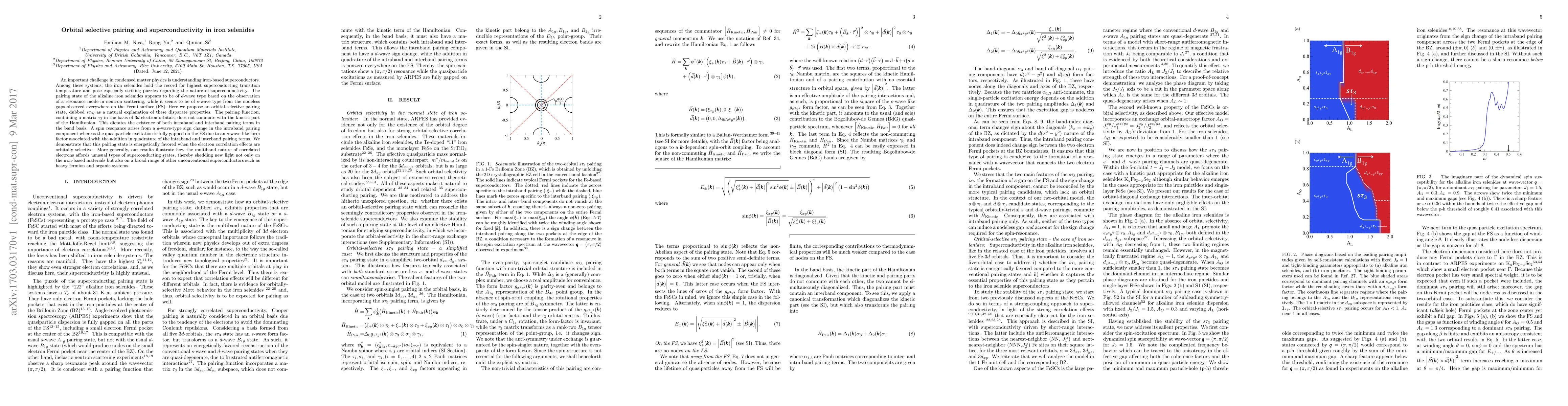 The paper proposes an orbital-selective pairing state, $s \tau_{3}$, to reconcile conflicting observations in iron selenides superconductors, suggesting both $d$-wave and $s$-wave pairing features. This multiband pairing state is energetically favored under orbitally selective electron correlation effects, providing new insights into unconventional superconductivity across various materials.