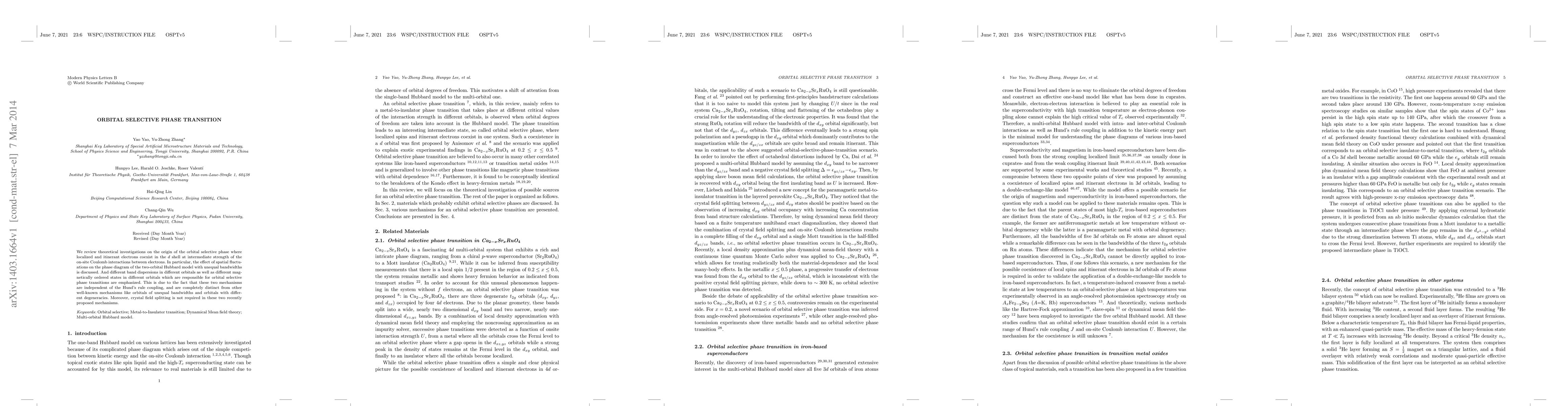 We review theoretical investigations on the origin of the orbital selective phase where localized and itinerant electrons coexist in the d shell at intermediate strength of the on-site Coulomb interactions between electrons. In particular, the effect of spatial fluctuations on the phase diagram of the two-orbital Hubbard model with unequal bandwidths is discussed. And different band dispersions in different orbitals as well as different magnetically ordered states in different orbitals which are responsible for orbital selective phase transitions are emphasized. This is due to the fact that these two mechanisms are independent of the Hund's rule coupling, and are completely distinct from other well-known mechanisms like orbitals of unequal bandwidths and orbitals with different degeneracies. Moreover, crystal field splitting is not required in these two recently proposed mechanisms.