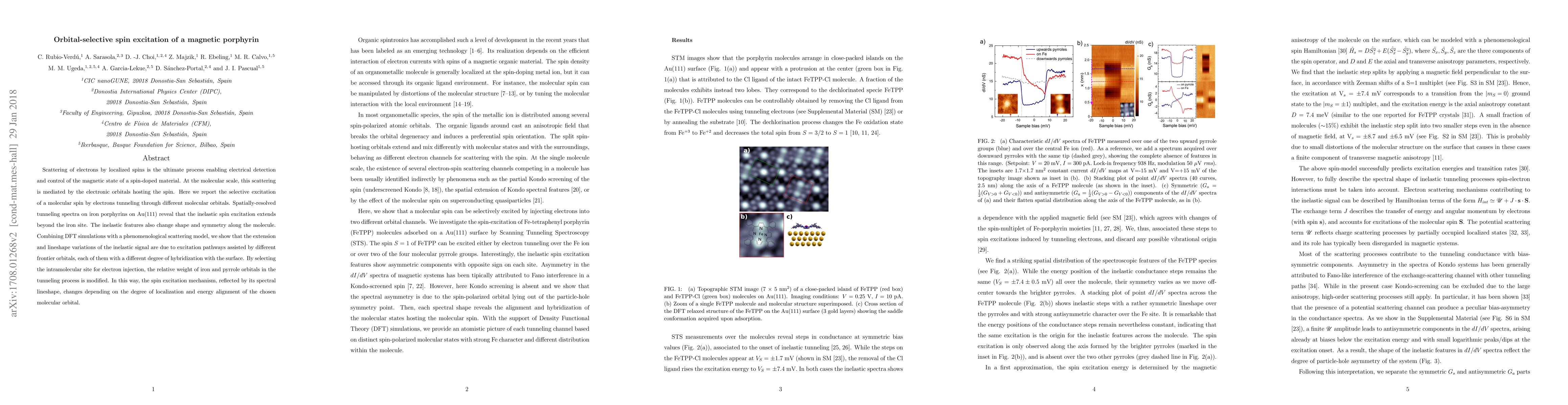 Scattering of electrons by localized spins is the ultimate process enabling electrical detection and control of the magnetic state of a spin-doped material. At the molecular scale, this scattering is mediated by the electronic orbitals hosting the spin. Here we report the selective excitation of a molecular spin by electrons tunneling through different molecular orbitals. Spatially-resolved tunneling spectra on iron porphyrins on Au(111) reveal that the inelastic spin excitation extends beyond the iron site. The inelastic features also change shape and symmetry along the molecule. Combining DFT simulations with a phenomenological scattering model, we show that the extension and lineshape variations of the inelastic signal are due to excitation pathways assisted by different frontier orbitals, each of them with a different degree of hybridization with the surface. By selecting the intramolecular site for electron injection, the relative weight of iron and pyrrole orbitals in the tunneling process is modified. In this way, the spin excitation mechanism, reflected by its spectral lineshape, changes depending on the degree of localization and energy alignment of the chosen molecular orbital.