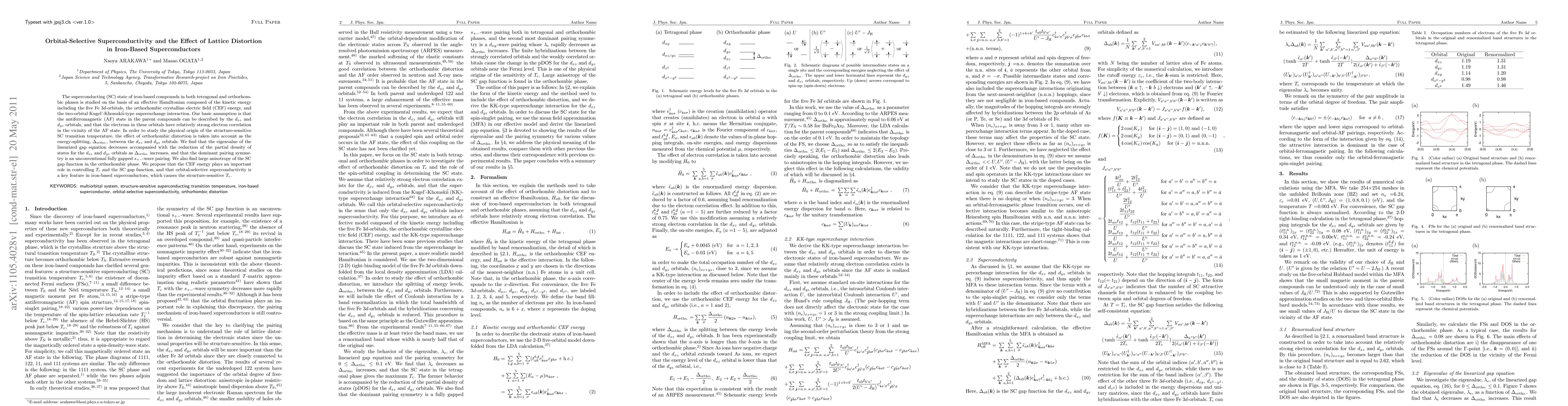 The superconducting (SC) state of iron-based compounds in both tetragonal and orthorhombic phases is studied on the basis of an effective Hamiltonian composed of the kinetic energy including the five Fe 3d-orbitals, the orthorhombic crystalline electric field (CEF) energy, and the two-orbital Kugel'-Khomski\u{i}-type superexchange interaction. Our basic assumption is that the antiferromagnetic (AF) state in the parent compounds can be described by the $d_{xz}$ and $d_{yz}$ orbitals, and that the electrons in these orbitals have relatively strong electron correlation in the vicinity of the AF state. In order to study the physical origin of the structure-sensitive SC transition temperature, the effect of orthorhombic distortion is taken into account as the energy-splitting, $\Delta_{\textrm{ortho.}}$, between the $d_{xz}$ and $d_{yz}$ orbitals. We find that the eigenvalue of the linearized gap equation decreases accompanied with the reduction of the partial density of states for the $d_{xz}$ and $d_{yz}$ orbitals as $\Delta_{\textrm{ortho.}}$ increases, and that the dominant pairing symmetry is an unconventional fully gapped $s_{+-}$-wave pairing. We also find large anisotropy of the SC gap function in the orthorhombic phase. We propose that the CEF energy plays an important role in controlling $T_{\textrm{c}}$ and the SC gap function, and that orbital-selective superconductivity is a key feature in iron-based superconductors, which causes the structure-sensitive $T_{\textrm{c}}$.