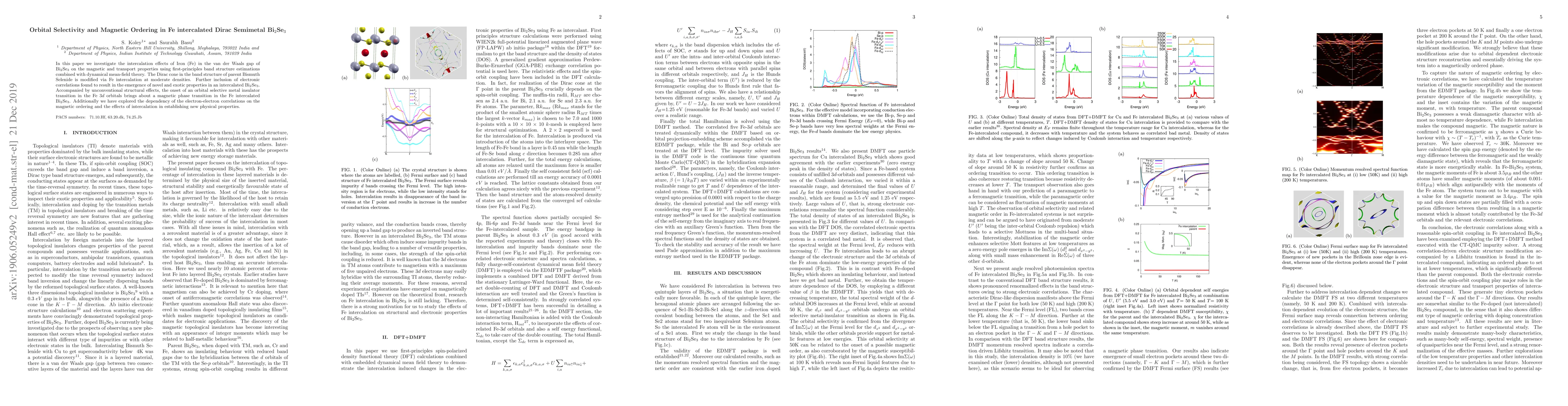 In this paper we investigate the intercalation effects of Iron (Fe) in the van der Waals gap of Bi$_2$Se$_3$ on the magnetic and transport properties using first-principles band structure estimations combined using dynamical mean-field theory. Inclusion of electronic correlations and spin-orbit coupling effects are found to result in the emergence of ferromagnetic properties in an intercalated Bi$_2$Se$_3$. Further the Dirac cone in the band structure of Bismuth Selenide is modified via Fe intercalation at moderate densities. Accompanied by novel structural effects, the onset of an orbital selective metal insulator transition in the Fe 3$d$ orbitals brings about a magnetic phase transition in the Fe intercalated Bi$_2$Se$_3$. Further we have explored the dependency of the inter-orbital electron-electron correlations on the magnetic ordering and the effects of intercalation in establishing new physical properties.