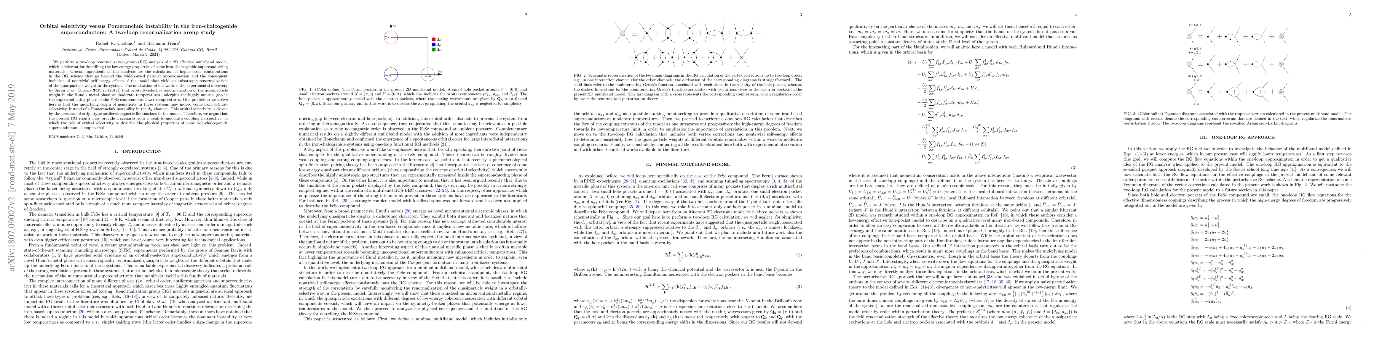 We perform a two-loop renormalization group (RG) analysis of a 2D effective multiband model, which is relevant for describing the low-energy properties of some iron-chalcogenide superconducting materials. Crucial ingredients in this analysis are the calculation of higher-order contributions in the RG scheme that go beyond the widely-used parquet approximation and the consequent inclusion of nontrivial self-energy effects of the model that yield an anisotropic renormalization of the quasiparticle weight in the system. The motivation of our work is the experimental discovery by Sprau et al. (2017) that orbitally-selective renormalization of the quasiparticle weight in the Hund's metal phase at moderate temperatures underpins the highly unusual gap in the superconducting phase of the FeSe compound at lower temperatures. One prediction we arrive here is that the underlying origin of nematicity in these systems may indeed come from orbital-selectivity, instead of a Pomeranchuk instability in the $d_{\pm}$ channel. This orbital selectivity is driven by the presence of stripe-type antiferromagnetic fluctuations in the model. Therefore, we argue that the present RG results may provide a scenario from a weak-to-moderate coupling perspective, in which the role of orbital selectivity to describe the physical properties of some iron-chalcogenide superconductors is emphasized.