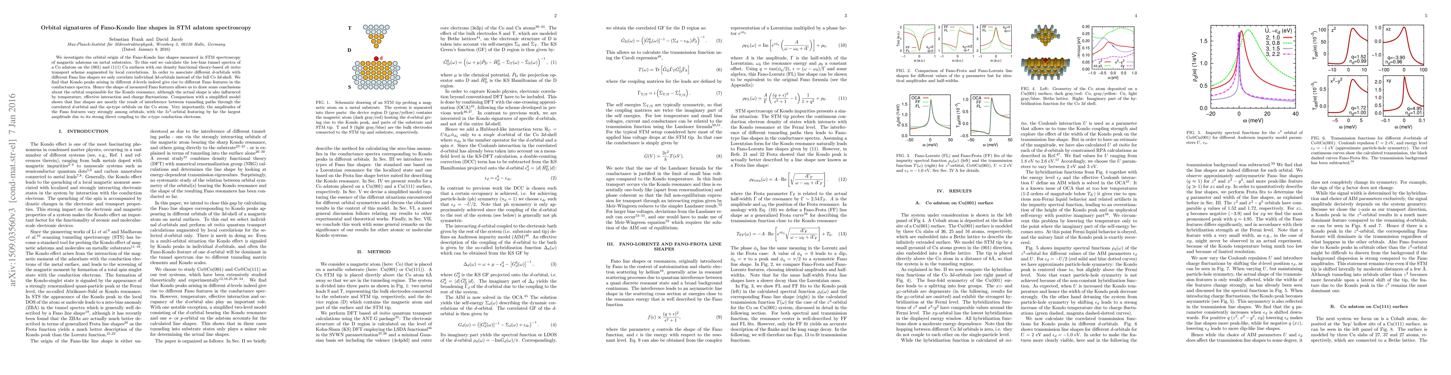 We investigate the orbital origin of the Fano-Kondo line shapes measured in STM spectroscopy of magnetic adatoms on metal substrates. To this end we calculate the low-bias tunnel spectra of a Co adatom on the (001) and (111) Cu surfaces with our density functional theory-based ab initio transport scheme augmented by local correlations. In order to associate different $d$-orbitals with different Fano line shapes we only correlate individual $3d$-orbitals instead of the full Co $3d$-shell. We find that Kondo peaks arising in different $d$-levels indeed give rise to different Fano features in the conductance spectra. Hence the shape of measured Fano features allows to draw some conclusions about the orbital responsible for the Kondo resonance, although the actual shape is also influenced by temperature, effective interaction and charge fluctuations. Comparison with a simplified model shows that line shapes are mostly the result of interference between tunneling paths through the correlated $d$-orbital and the $sp$-type orbitals on the Co atom. Very importantly, the amplitudes of the Fano features vary strongly among orbitals, with the $3z^2$-orbital featuring by far the largest amplitude due to its strong direct coupling to the $s$-type conduction electrons.