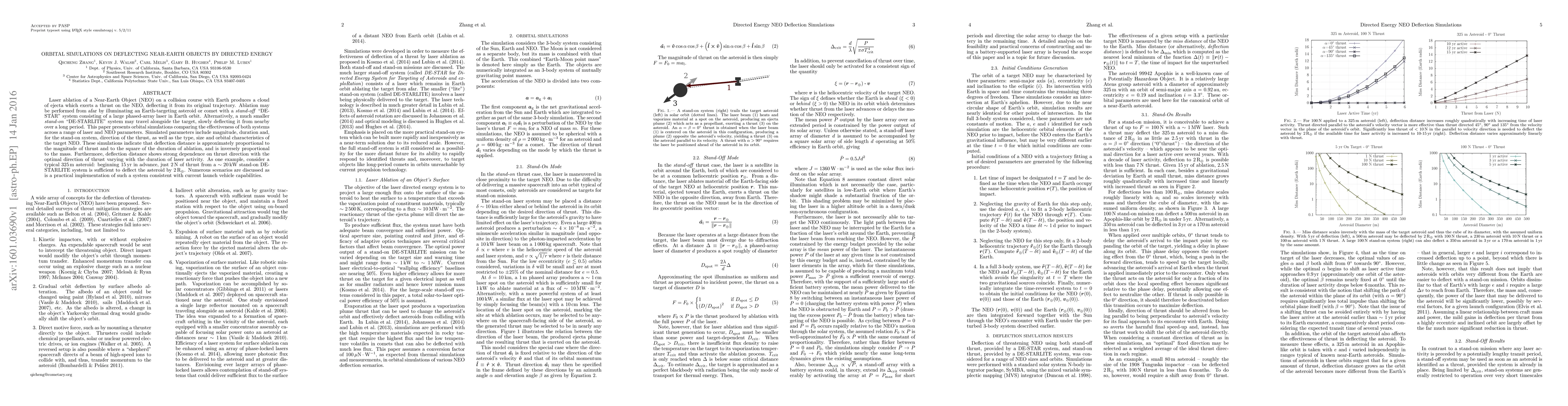 Researchers used orbital simulations to test two methods for deflecting Near-Earth Objects: a large phased-array laser in Earth orbit or a smaller system that travels alongside the target, using it to slowly deflect the object over time. The results show that deflection distance is related to thrust magnitude and duration, as well as the direction of the thrust.