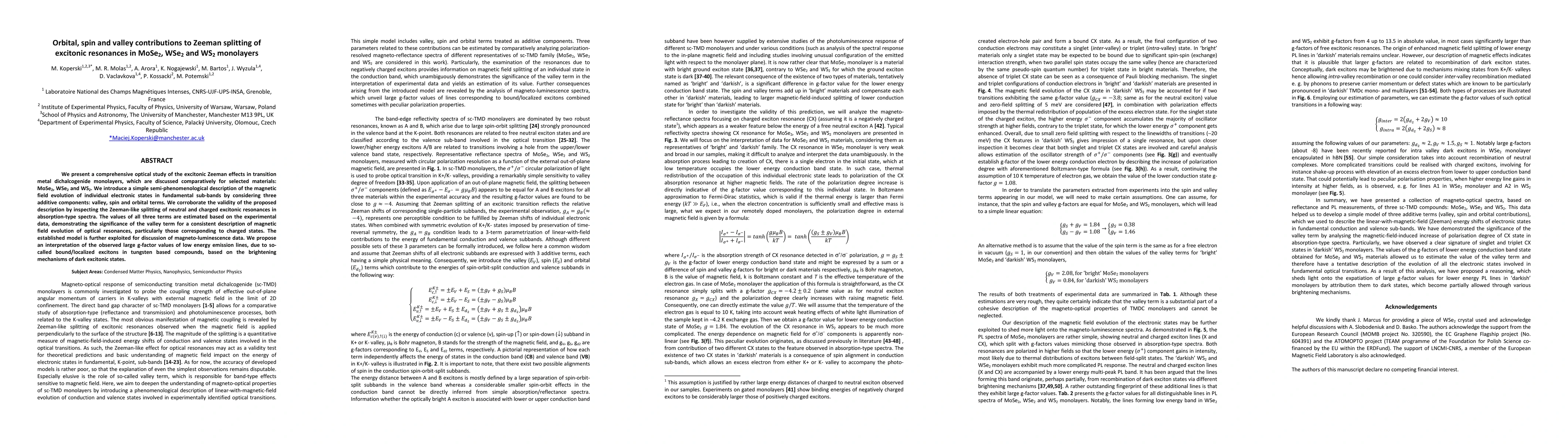 This research studies the Zeeman effects in monolayers of MoSe$_2$, WSe$_2$, and WS$_2$, identifying contributions from orbital, spin, and valley terms to the splitting of excitonic resonances. The model proposed accurately describes the magnetic field's influence on optical resonances, especially for charged states, and interprets large g-factors in tungsten-based compounds through exciton brightening mechanisms.