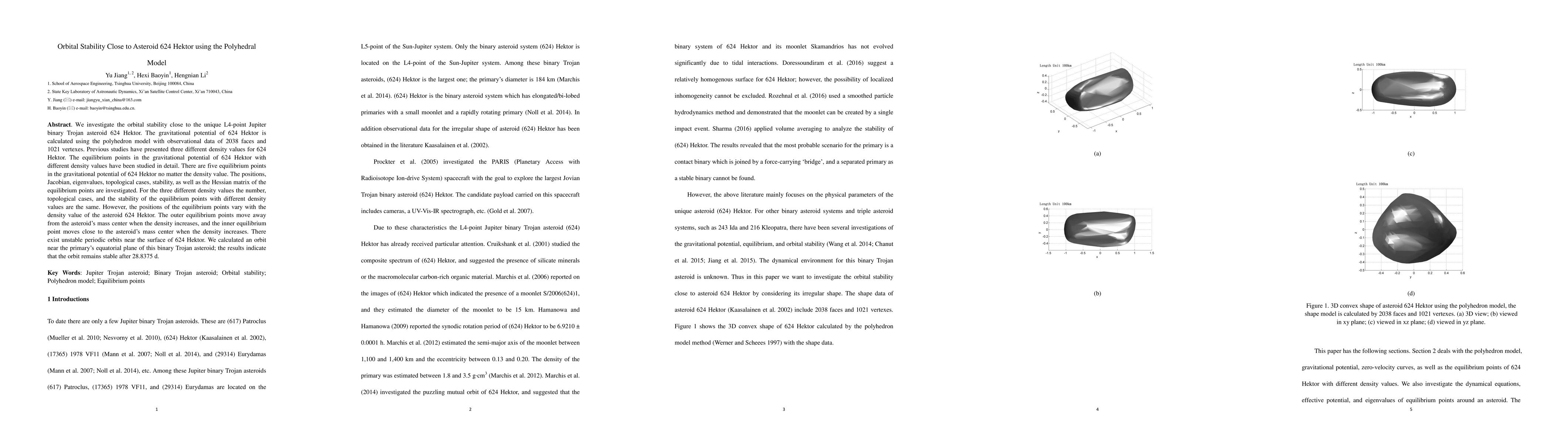 We investigate the orbital stability close to the unique L4-point Jupiter binary Trojan asteroid 624 Hektor. The gravitational potential of 624 Hektor is calculated using the polyhedron model with observational data of 2038 faces and 1021 vertexes. Previous studies have presented three different density values for 624 Hektor. The equilibrium points in the gravitational potential of 624 Hektor with different density values have been studied in detail. There are five equilibrium points in the gravitational potential of 624 Hektor no matter the density value. The positions, Jacobian, eigenvalues, topological cases, stability, as well as the Hessian matrix of the equilibrium points are investigated. For the three different density values the number, topological cases, and the stability of the equilibrium points with different density values are the same. However, the positions of the equilibrium points vary with the density value of the asteroid 624 Hektor. The outer equilibrium points move away from the asteroid s mass center when the density increases, and the inner equilibrium point moves close to the asteroid s mass center when the density increases. There exist unstable periodic orbits near the surface of 624 Hektor. We calculated an orbit near the primary s equatorial plane of this binary Trojan asteroid, the results indicate that the orbit remains stable after 28.8375 d.