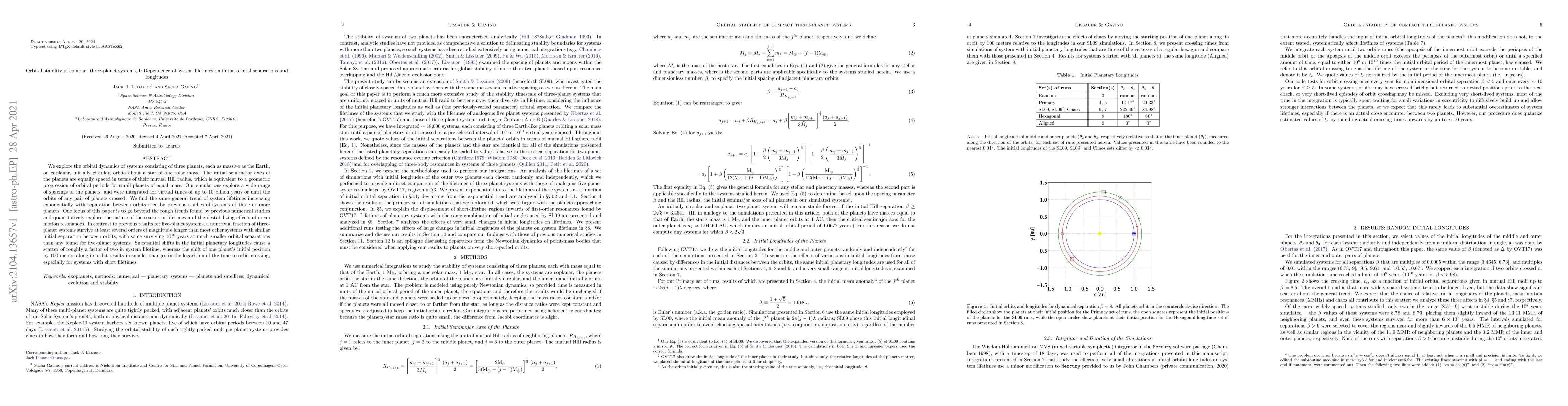 We explore the orbital dynamics of systems consisting of three planets, each as massive as the Earth, on coplanar, initially circular, orbits about a star of one solar mass. The initial semimajor axes of the planets are equally spaced in terms of their mutual Hill radius, which is equivalent to a geometric progression of orbital periods for small planets of equal mass. Our simulations explore a wide range of spacings of the planets, and were integrated for virtual times of up to 10 billion years or until the orbits of any pair of planets crossed. We find the same general trend of system lifetimes increasing exponentially with separation between orbits seen by previous studies of systems of three or more planets. One focus of this paper is to go beyond the rough trends found by previous numerical studies and quantitatively explore the nature of the scatter in lifetimes and the destabilizing effects of mean motion resonances. In contrast to previous results for five-planet systems, a nontrivial fraction of three-planet systems survive at least several orders of magnitude longer than most other systems with similar initial separation between orbits, with some surviving $10^{10}$ years at much smaller orbital separations than any found for five-planet systems. Substantial shifts in the initial planetary longitudes cause a scatter of roughly a factor of two in system lifetime, whereas the shift of one planet's initial position by 100 meters along its orbit results in smaller changes in the logarithm of the time to orbit crossing, especially for systems with short lifetimes.