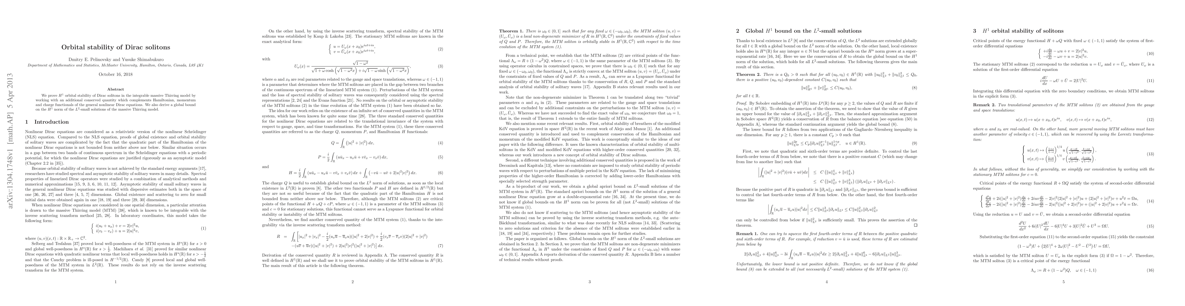 This paper proves the $H^1$ orbital stability of Dirac solitons in the massive Thirring model by introducing an additional conserved quantity alongside Hamiltonian, momentum, and charge. It also establishes a global bound on the $H^1$ norm of $L^2$-small solutions for the model.