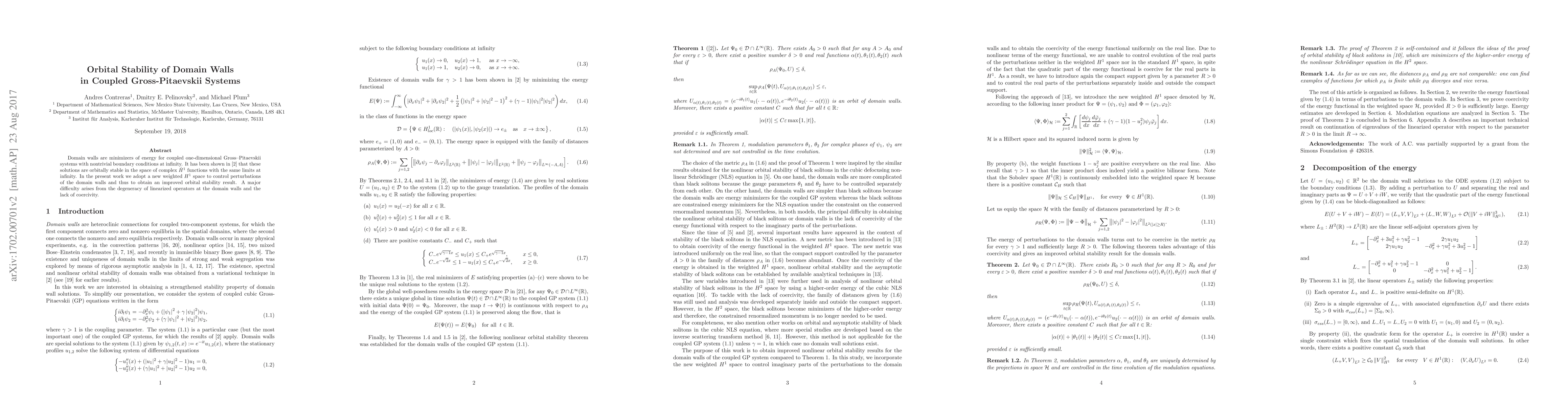 This paper investigates the orbital stability of domain walls in coupled one-dimensional Gross-Pitaevskii systems, employing a new weighted $H^1$ space to enhance stability results despite the degeneracy of linearized operators and lack of coercivity.