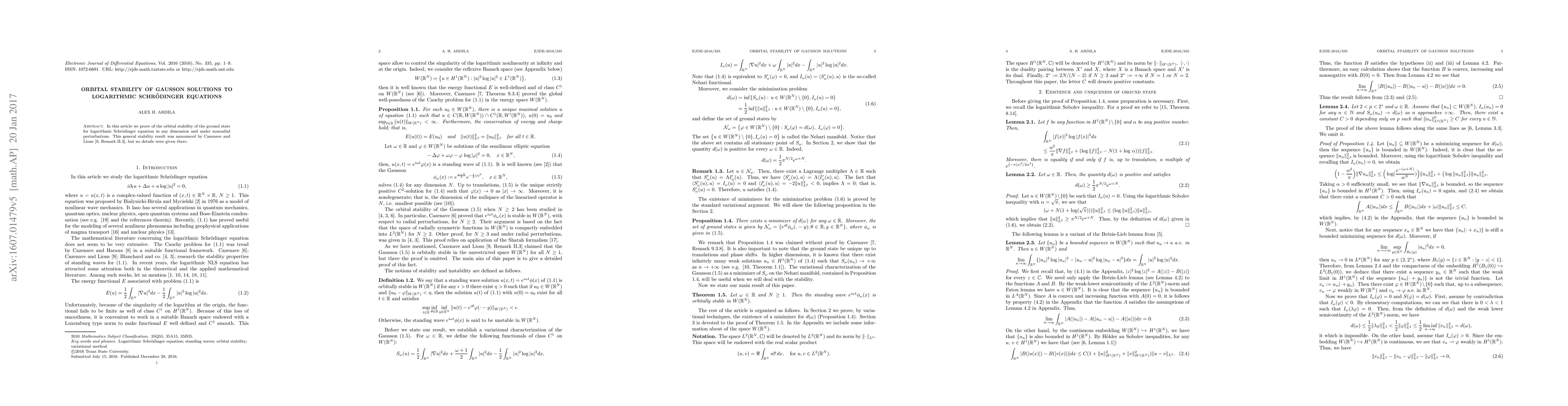 Summary: This paper proves the orbital stability of ground state solutions for logarithmic Schrödinger equations in any dimension, even under nonradial perturbations. The findings establish the robustness of these solutions against small disturbances.