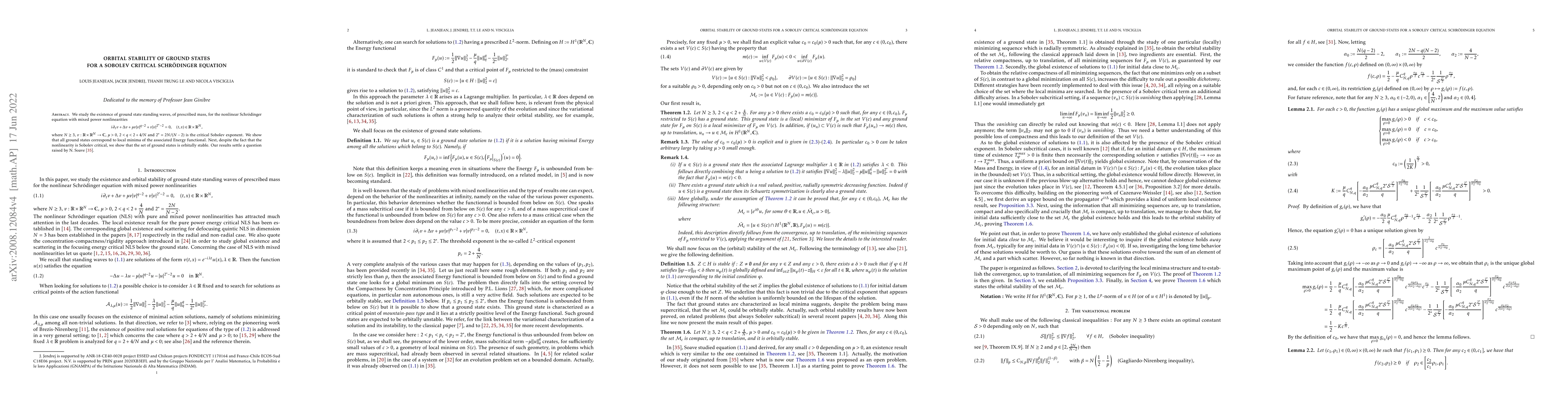 This research proves the orbital stability of ground state standing waves for a Sobolev critical Schrödinger equation with mixed power nonlinearities, showing they correspond to local minima of the energy functional. It resolves a question posed by N. Soave.