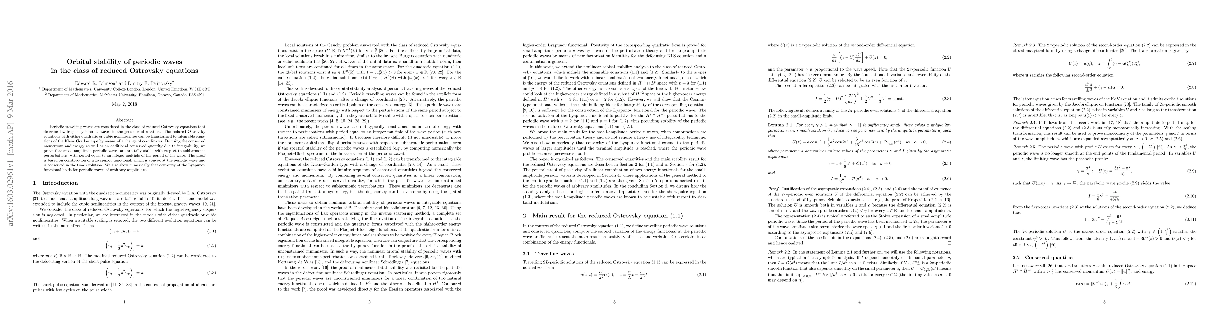 This paper investigates the orbital stability of periodic waves in reduced Ostrovsky equations, which model low-frequency internal waves. It proves that small-amplitude periodic waves are stable with respect to subharmonic perturbations using conserved quantities and a constructed Lyapunov functional, and numerically verifies this stability for waves of arbitrary amplitudes.