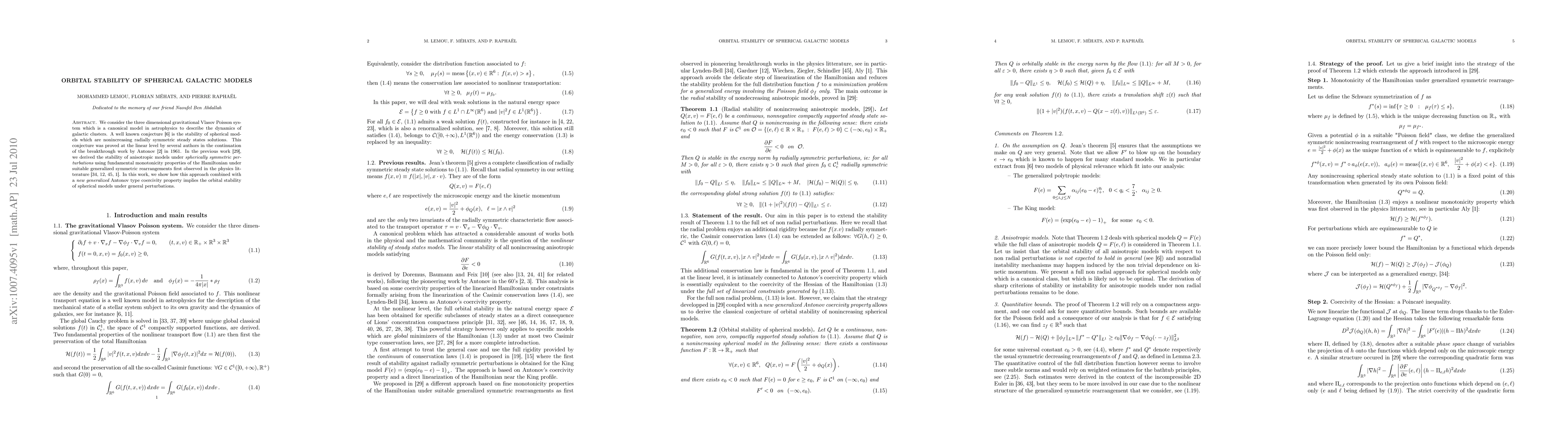 We consider the three dimensional gravitational Vlasov Poisson system which is a canonical model in astrophysics to describe the dynamics of galactic clusters. A well known conjecture is the stability of spherical models which are nonincreasing radially symmetric steady states solutions. This conjecture was proved at the linear level by several authors in the continuation of the breakthrough work by Antonov in 1961. In a previous work (arXiv:0904.2443), we derived the stability of anisotropic models under {\it spherically symmetric perturbations} using fundamental monotonicity properties of the Hamiltonian under suitable generalized symmetric rearrangements first observed in the physics litterature. In this work, we show how this approach combined with a {\it new generalized} Antonov type coercivity property implies the orbital stability of spherical models under general perturbations.
