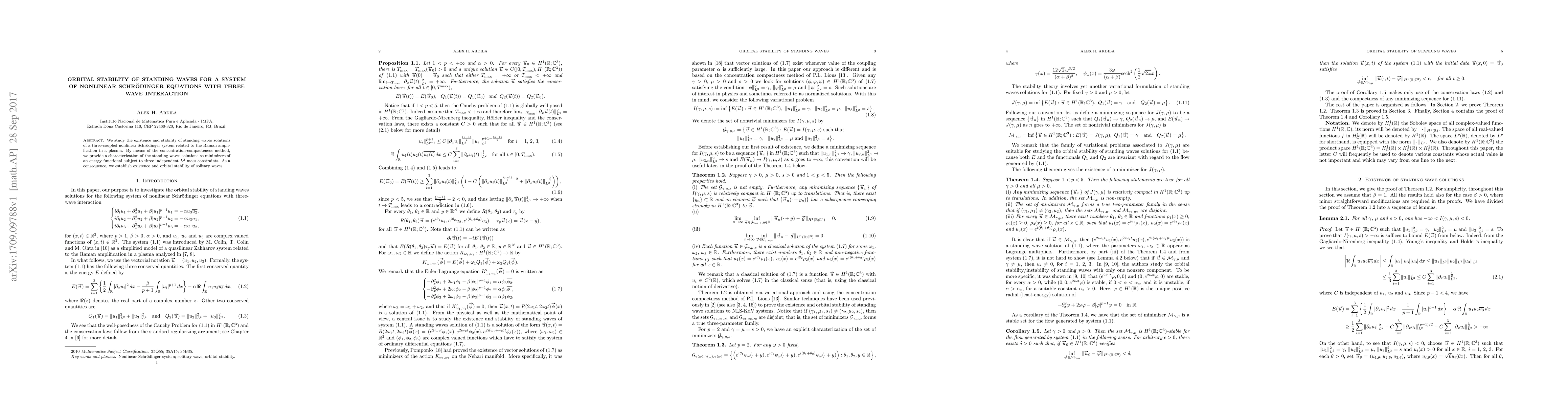 This paper investigates standing wave solutions for a three-coupled nonlinear Schrödinger system, focusing on Raman amplification in plasma. It uses the concentration-compactness method to characterize these solutions as minimizers of an energy functional, establishing their existence and orbital stability.