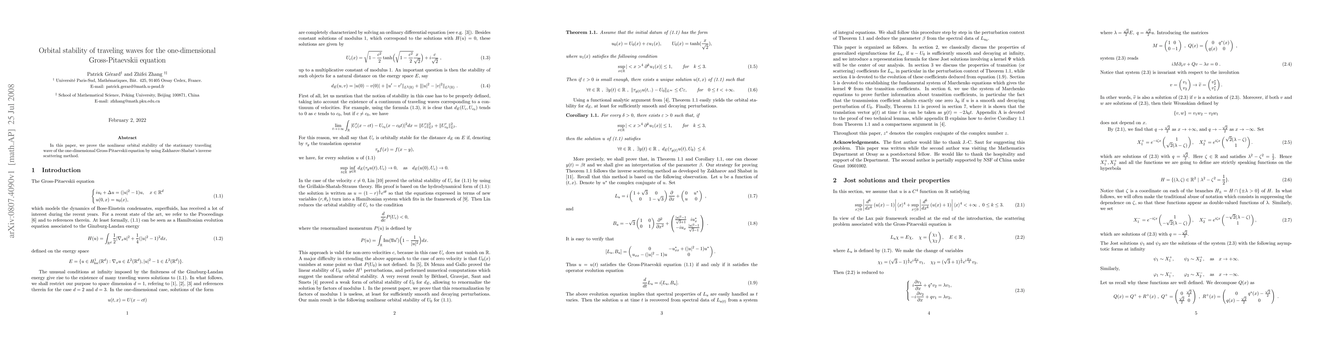 This paper establishes the nonlinear orbital stability of stationary traveling waves for the one-dimensional Gross-Pitaevskii equation using the inverse scattering method developed by Zakharov and Shabat.