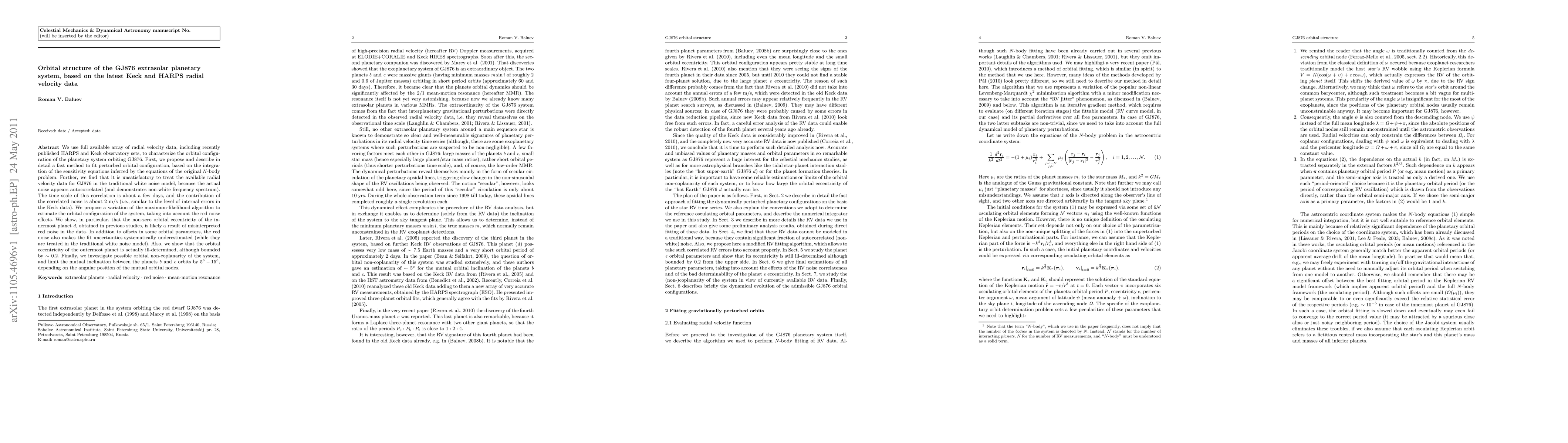 This study characterizes the orbital configuration of GJ876's planetary system using updated radial velocity data from Keck and HARPS observatories. It proposes a new method to fit perturbed orbital configurations, revealing that red noise, not white noise, better models the data, leading to revised orbital parameters and uncertainties.